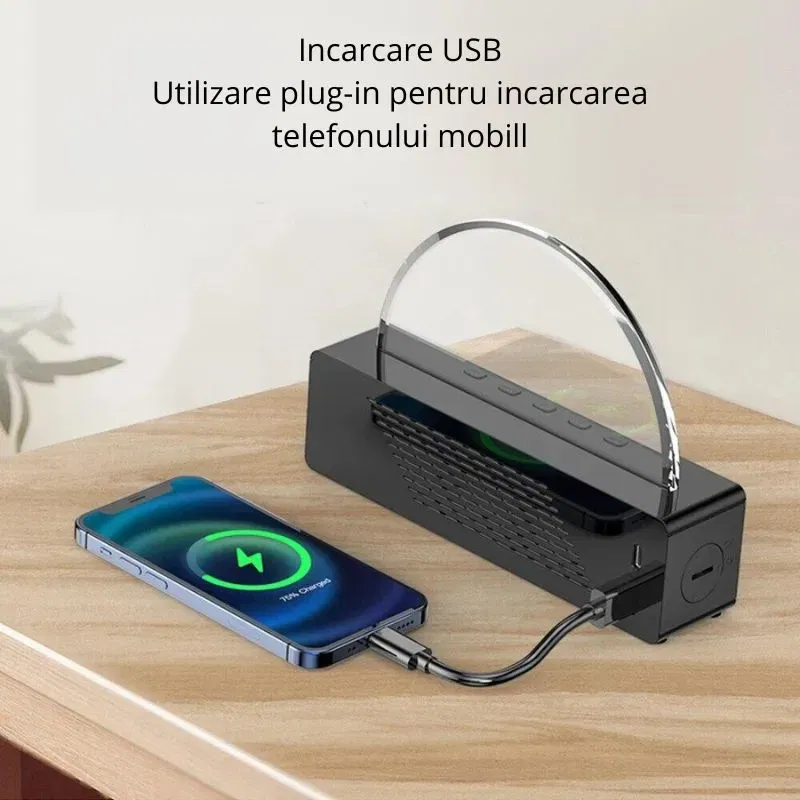Lumina ajustabila a ceasului te ajuta sa te trezesti treptat, imitand rasaritul soarelui, in timp ce afisajul digital mare ofera o vizualizare clara a orei, zilei si temperaturii camerei. Cu un control simplu prin buton rotativ, poti regla usor luminozitatea si poti alege dintr-o varietate de culori si moduri dinamice de lumina ambientala pentru a crea atmosfera potrivita fiecarei situatii. In plus, ceasul este echipat cu un port USB pentru a-ti incarca telefonul in timpul noptii, facandu-l un companion multifunctional perfect.
