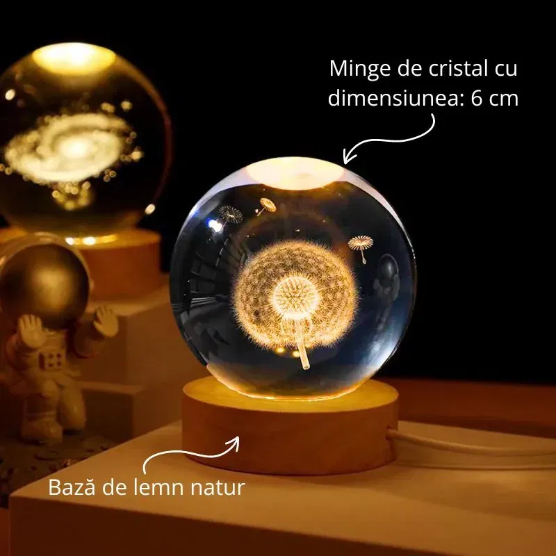 Utilizare: Arunca un ochi catre cea mai apropiata sursa de lumina. Ai gasit-o deja? Bravo! Acum pozitioneaza baza din lemn pe noptiera, adauga globul in cercul special dedicat si conecteaza lampa Glob de Cristal cu Papadie, cadou incantator la sursa de alimentare. Acum esti gata s-o admiri si sa numeri cate papadii iti vad ochii cu fiecare clipire.