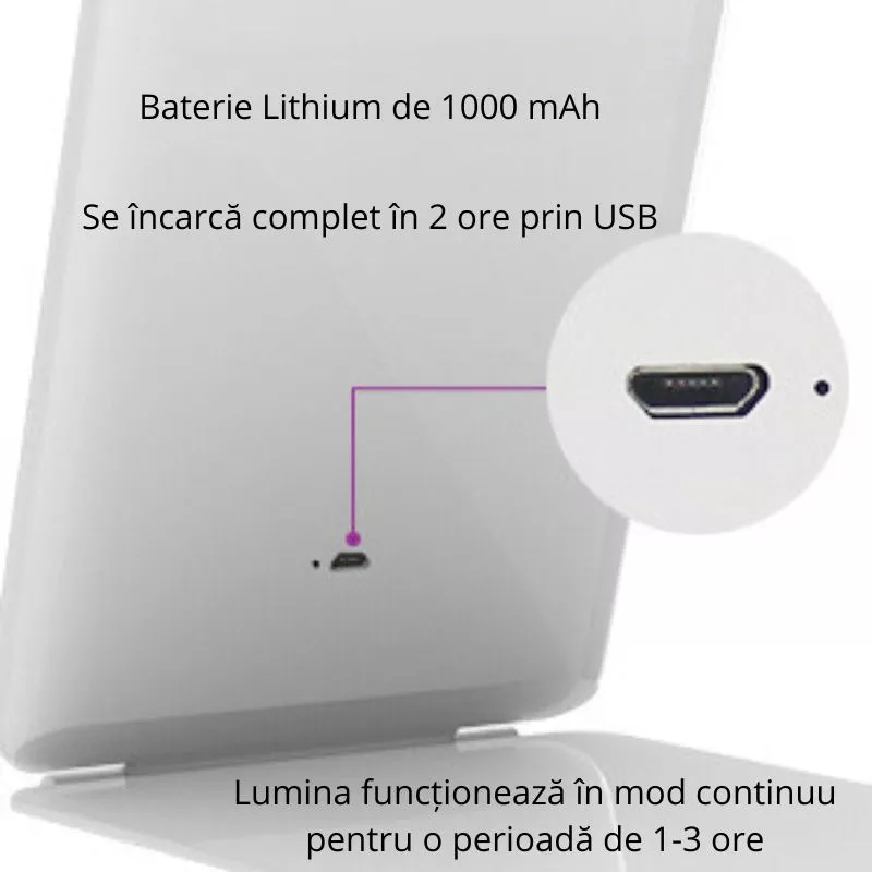 Functioneaza cu o baterie Lithium reincarcabila de 1000 mAh care-i activeaza cele 72 de led-uri printr-o atingere senzoriala. Lumina poate functiona constant intre 1-3 ore dupa 2 ore de incarcare ca fulgerul. Bineinteles, isi poate schimba aspectul avand in vedere setarea luminii in cele 3 spectre diferite (lumina naturala, rece sau calda) in functie de preferintele sale si de intensitatea luminii ambientale.