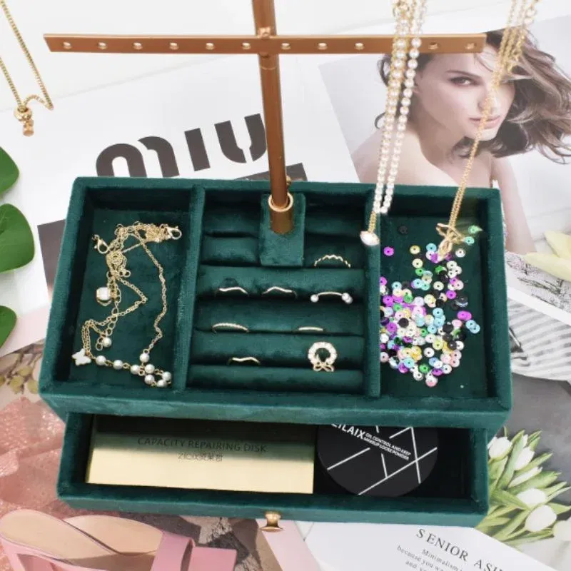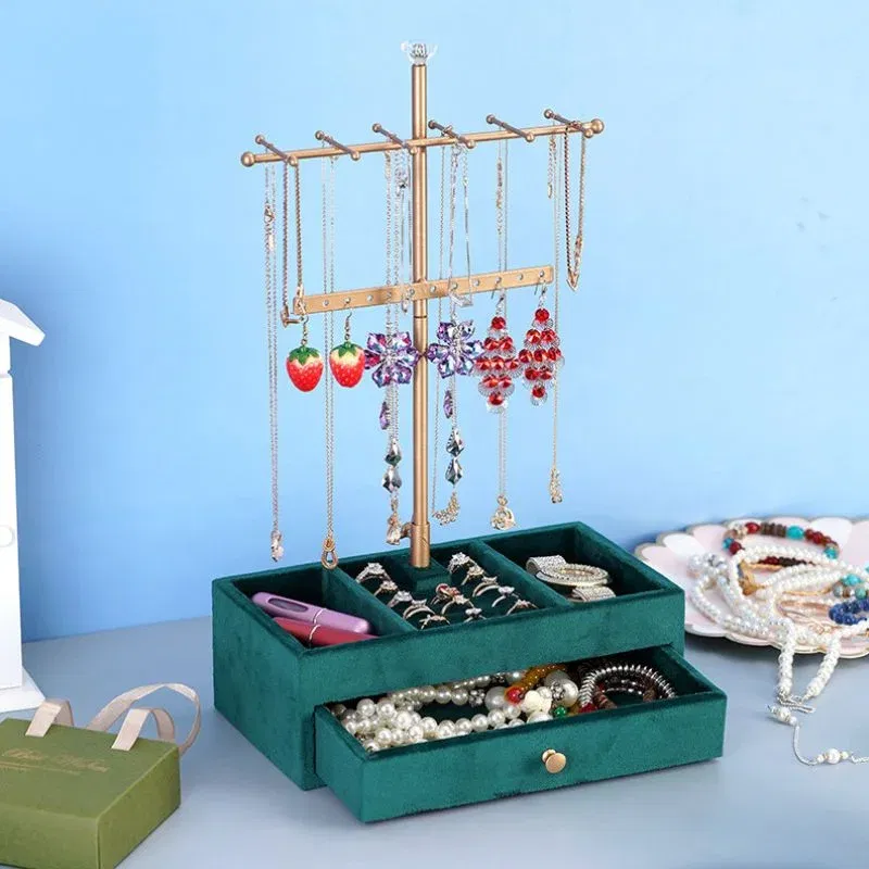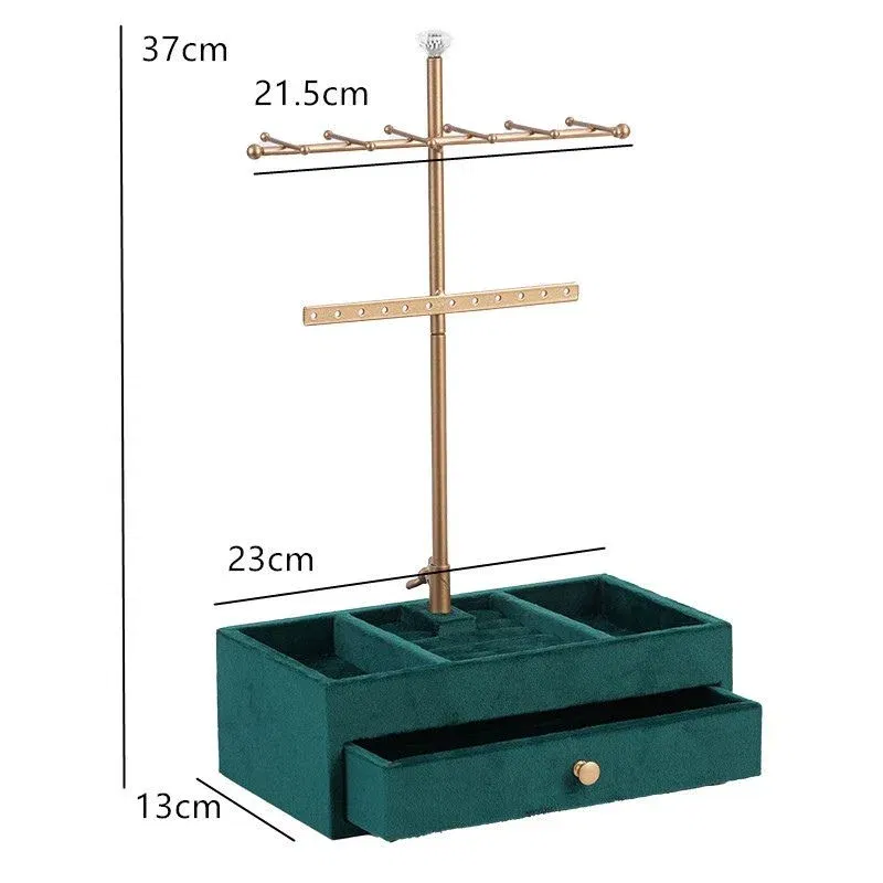 Organizatorul de bijuterii Verde Smarald este un accesoriu elegant si practic, perfect pentru pastrarea bijuteriilor intr-un mod organizat si sofisticat. Cu un design modern, acest organizator dispune de suporturi multiple pentru coliere, bratari si cercei, precum si compartimente si un sertar pentru inele, ceasuri sau alte accesorii. Realizat dintr-un material catifelat de culoare verde smarald si cu detalii aurii, adauga un plus de rafinament spatiului tau. Dimensiunile compacte (23 x 13 x 37 cm) il fac usor de amplasat pe orice masa de toaleta sau noptiera. Este solutia ideala pentru a pastra toate bijuteriile tale la indemana si intr-un singur loc.