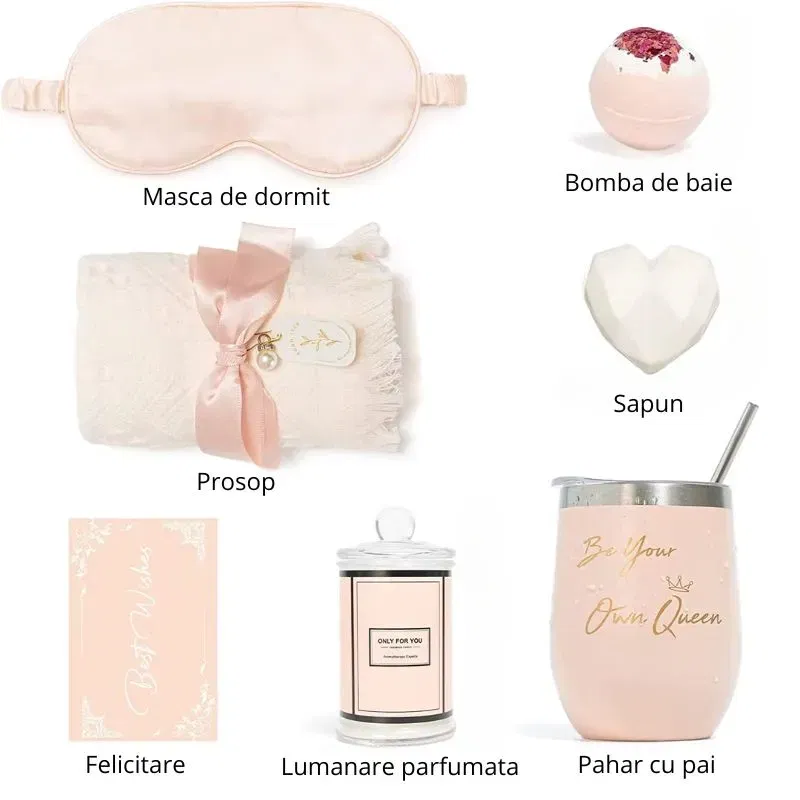 Fiecare produs din set este atent selectat pentru a aduce un plus de confort si relaxare, de la produsele de baie parfumate pana la accesoriile practice si elegante.