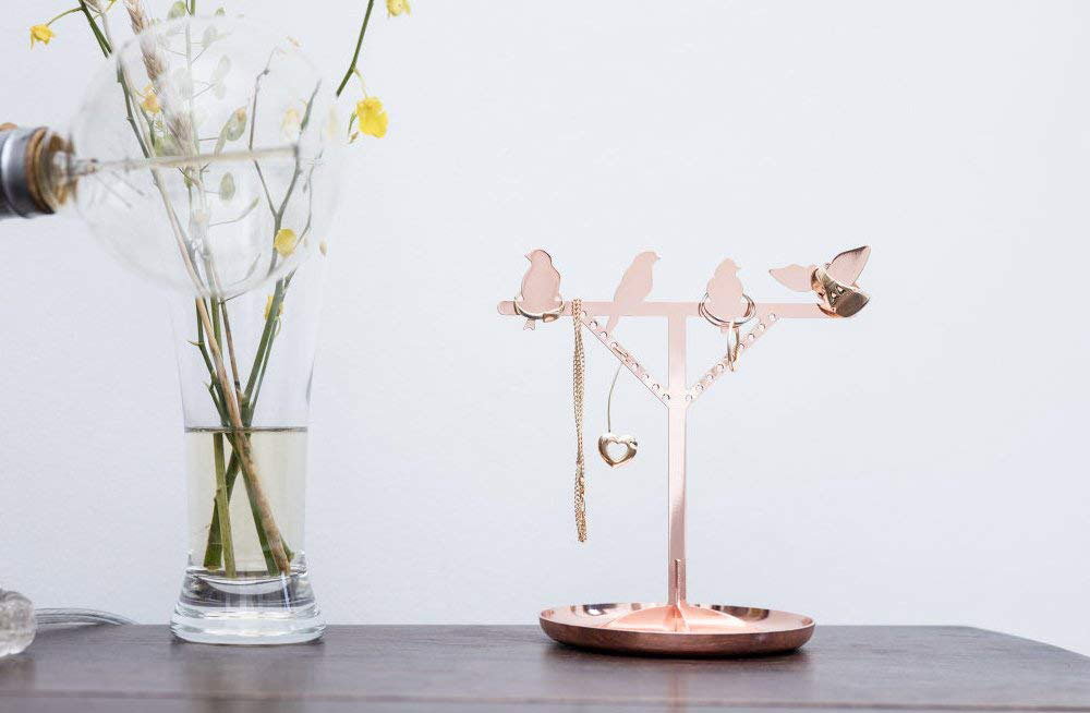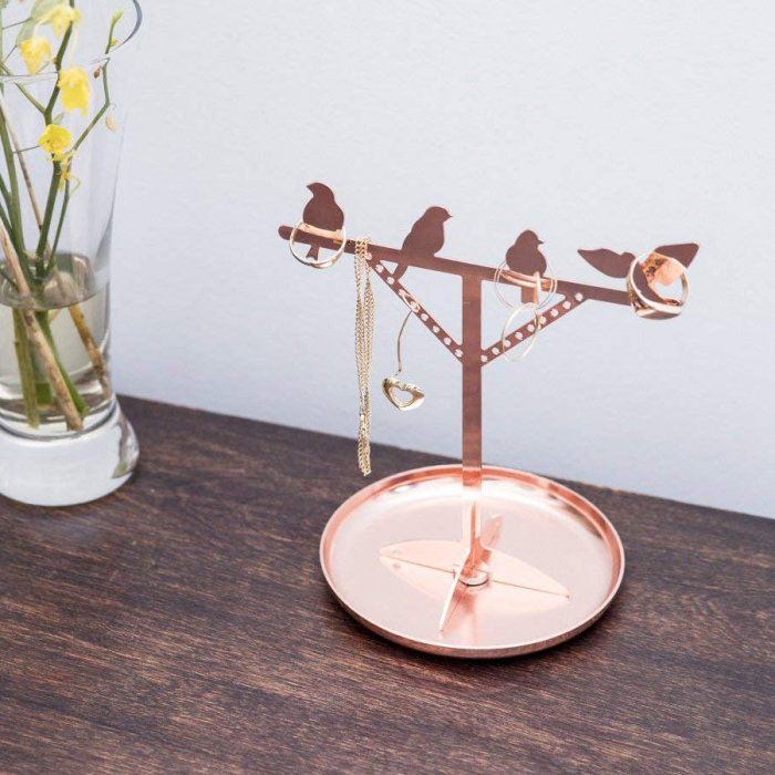 Utilizare: Ofera cadou Suport bijuterii Birdies pentru o femeie eleganta si cocheta din viata ta. Orice reprezentanta a sexului frumos va indragi si va folosi cu placere standul pretios. Nuanta sa aurie de trandafir se potriveste perfect cu mobilierul inchis sau deschis la culoare. Designul este feminin, rafinat si modern