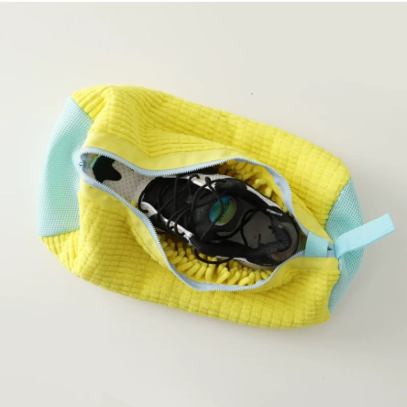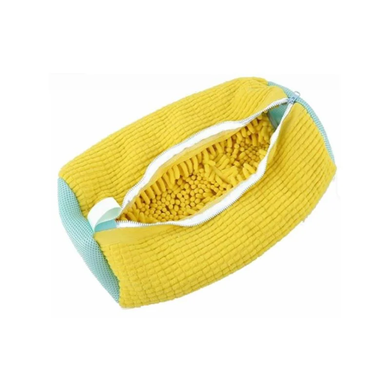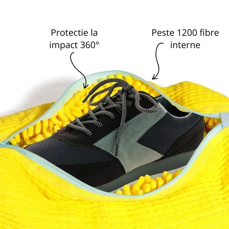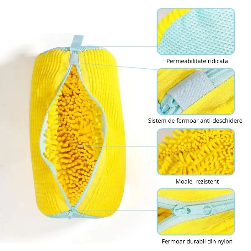 Aceasta husa de curatare pentru incaltaminte este o inventie inteligenta care transforma rutina spalarii pantofilor intr-o operatiune eficienta si sigura. Confectionata dintr-un material rezistent, moale si delicat cu suprafetele, husa protejeaza masina de spalat de impactul pantofilor si, in acelasi timp, curata incaltamintea in profunzime. Are o structura interioara cu peste 1000 de perisori din microfibra, meniti sa curete eficient murdaria, prafurile si petele de pe pantofi.