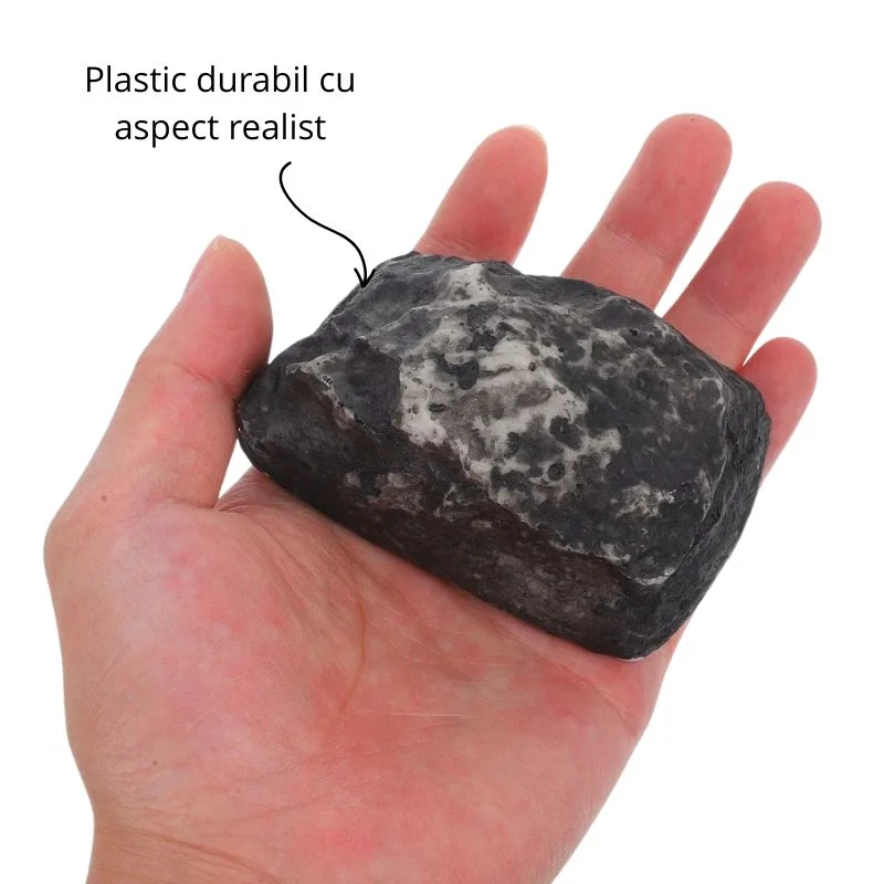 Fabricata din plastic durabil si rezistent la intemperii, aceasta piatra cu ascunzatoare nu doar ca rezista la ploaie, vant si ninsoare, dar nici nu ruginește sau se deterioreaza in timp. Aspectul este realist, cu textura neregulata si culori inchise, ceea ce o face aproape imposibil de deosebit fata de o piatra obisnuita din natura. Este alegerea perfecta pentru case, cabane, rulote sau oricine are nevoie de o rezerva la indemana.