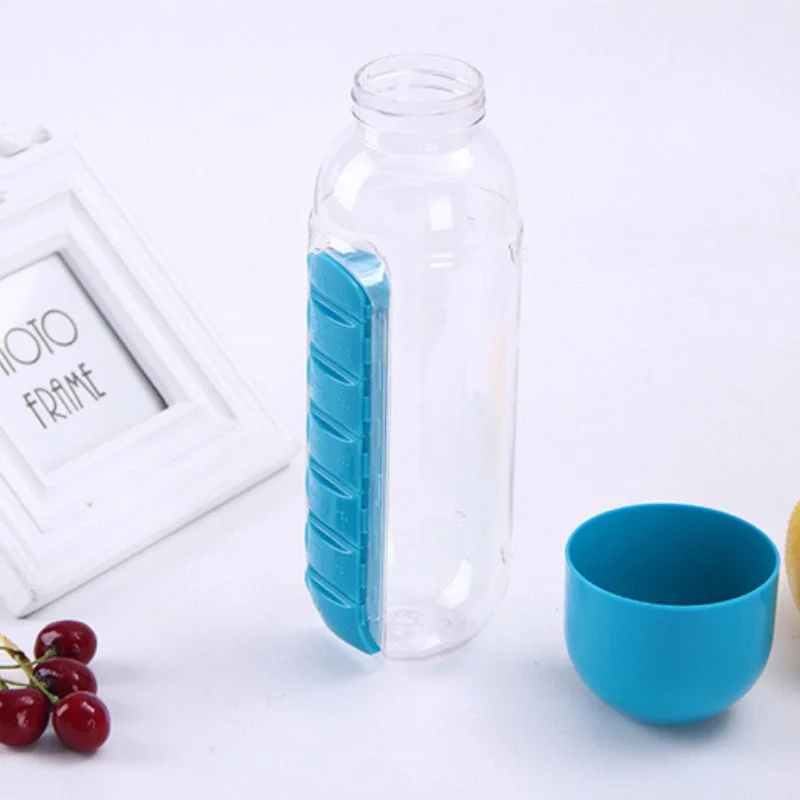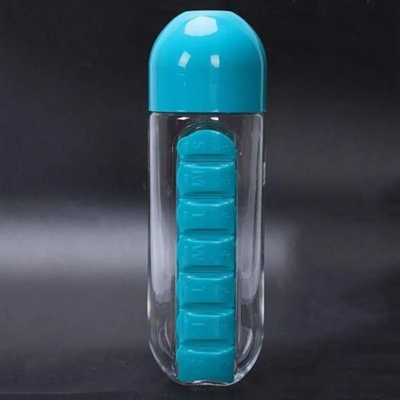 Realizata din material de calitate alimentara, fara BPA si complet sigur pentru sanatate, sticla are o capacitate de 600 ml si un compartiment integrat cu 7 spatii – cate unul pentru fiecare zi a saptamanii. Compartimentul pentru pastile se inchide ermetic si este usor de accesat, iar capacul sticlei este rotunjit, ergonomic si usor de desfacut.