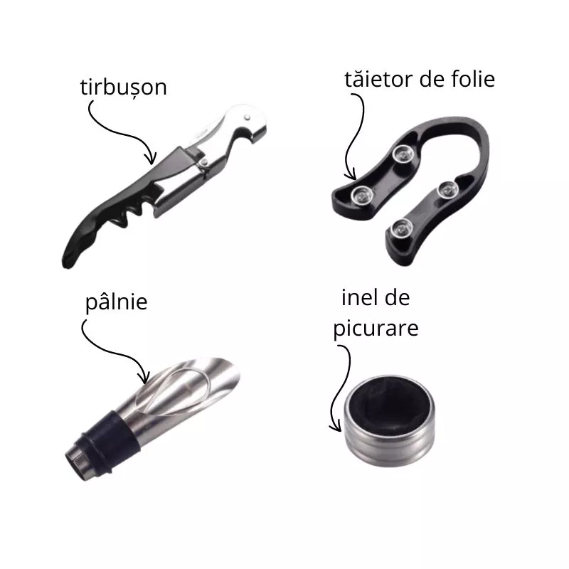 - Are incluse toate accesoriile necesare pentru a putea servi vinul preferat.