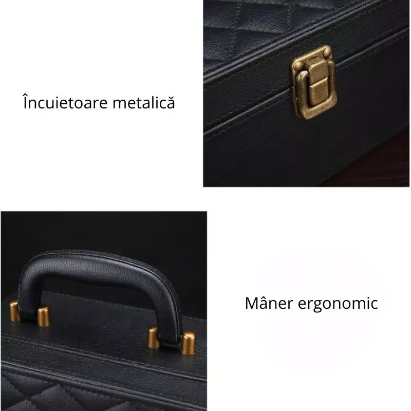 - Construita din materiale durabile si cu o atractivitate ridicata, cutia are un aspect premium, lucru ce se datoreaza pielii ecologice negre fine, dar si a cusaturii stilate;
