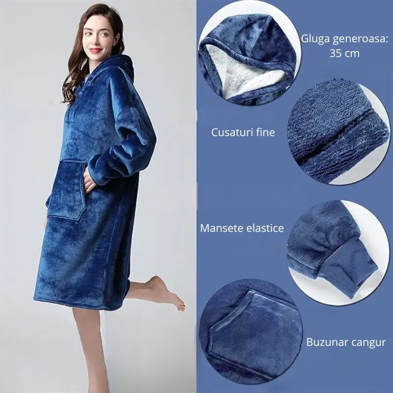 Vrei sa te simti rasfatat din cap pana in picioare? Acum poti, cu hanoracul-patura supradimensionat din flanel si polar ultra-calduros. Gata cu hainele incomode sau paturile care nu raman la locul lor! Imbratiseaza libertatea de miscare si rasfatul unui hanorac lung, moale si pufos, care iti ofera tot ce ai nevoie pentru relaxare.