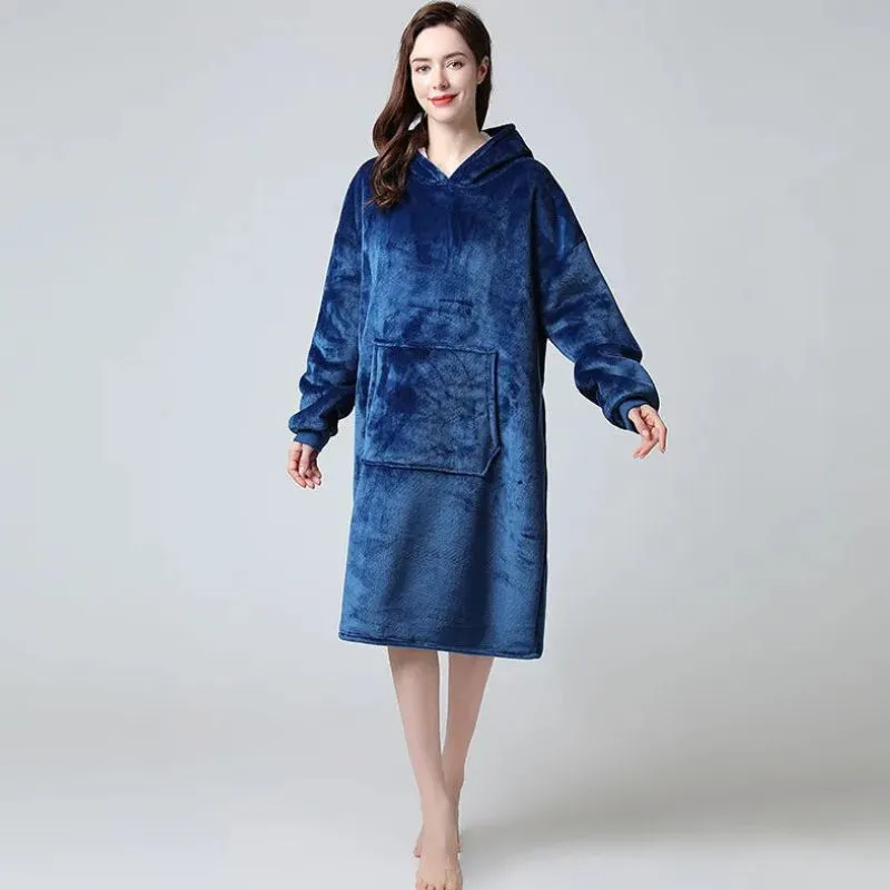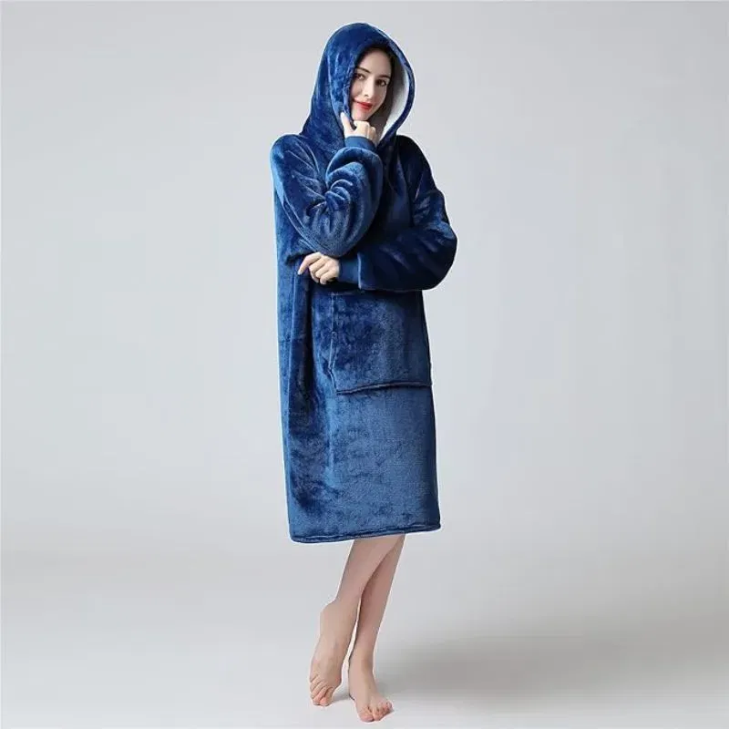 Cand caldura intalneste confortul extrem, tu primesti acest Hanorac patura cu maneci, gluga si buzunar cangur, Flanel & Polar, 370g/mp, 135 cm, Albastru care te va face sa te simti ca un rege sau regina a confortului! Fie ca vrei sa lenevesti acasa, sa iesi la aer curat sau sa te incalzesti dupa o zi grea, acest hanorac-patura iti va fi cel mai bun prieten.