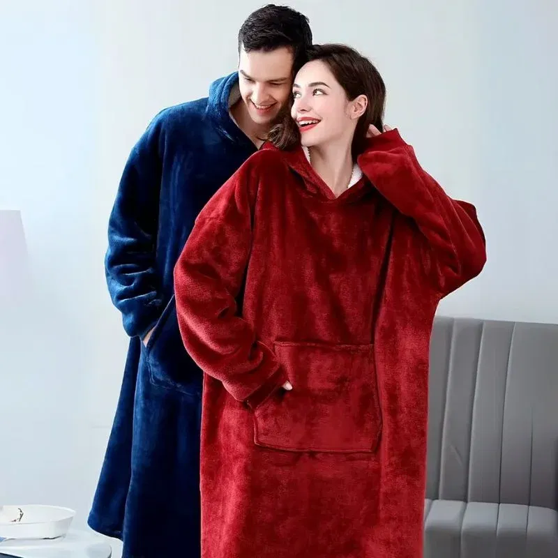 Hanorac patura cu maneci gluga si buzunar cangur Flanel & Polar 370g/mp 135 cm Albastru si Hanorac patura cu maneci gluga si buzunar cangur Flanel & Polar 370g/mp 135 cm Rosu. Perfecte pentru serile racoroase, aceste paturi sunt gandite sa va ofere caldura, stil si confort in orice moment.