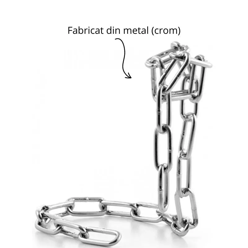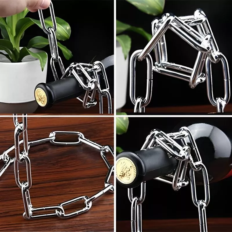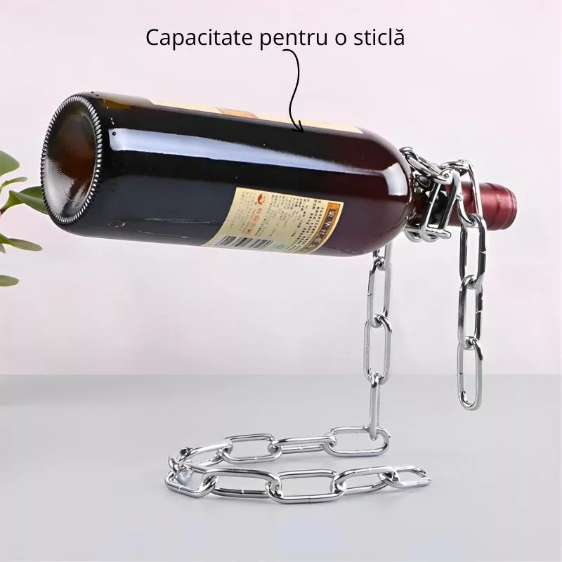 Suport lant sticla de vin Pluteste este compus din mai multe zale rigide din metal, sudate intre ele, cu un orificiu format in partea de sus, care primeste gatul sticle. Lantul argintat pare subtil legat de gatul sticlei si intreaga priveliste uimeste teribil.