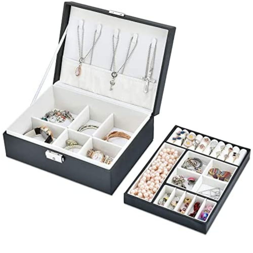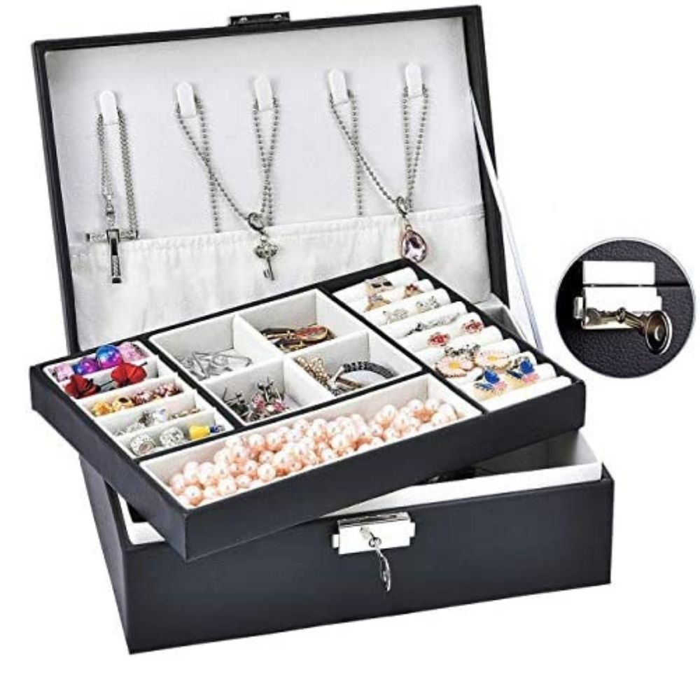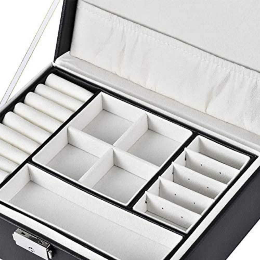 Aceasta Cutie bijuterii neagra, Amore are un design multi-strat cu un compartiment mobil, cu capacitate mare, inclusiv diverse spatii de depozitare, agatatori pentru coliere, suporturi inele si card pentru cercei.