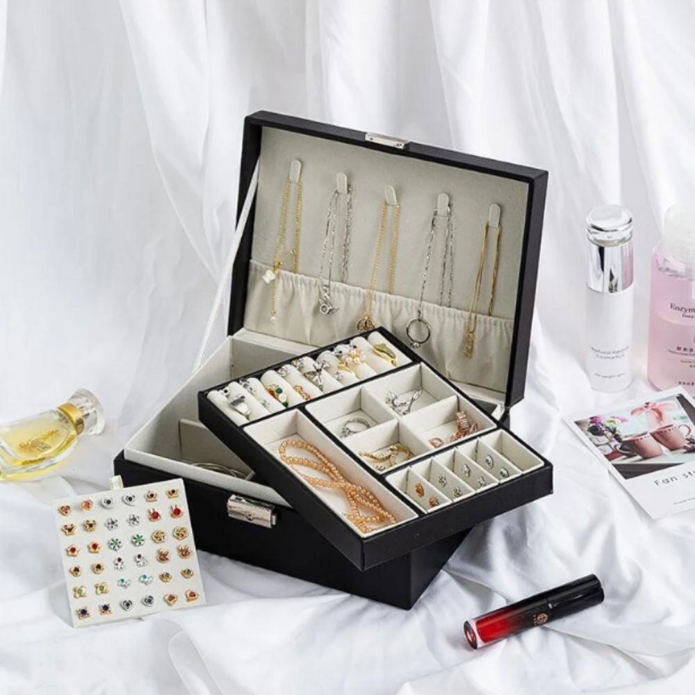 Astfel, Cutie bijuterii neagra, Amore este alegerea perfecta pentru tine, deoarece ea iti va permite sa iti organizezi mai bine colectia cu accesoriile preferate. Deoarece, daca nu ai loc suficient sau nici macar unul special amenajat pentru colectia ta de bijuterii, risti ca veritabilele tale comori sa se piarda, sa se zgarie sau sa se uzeze.