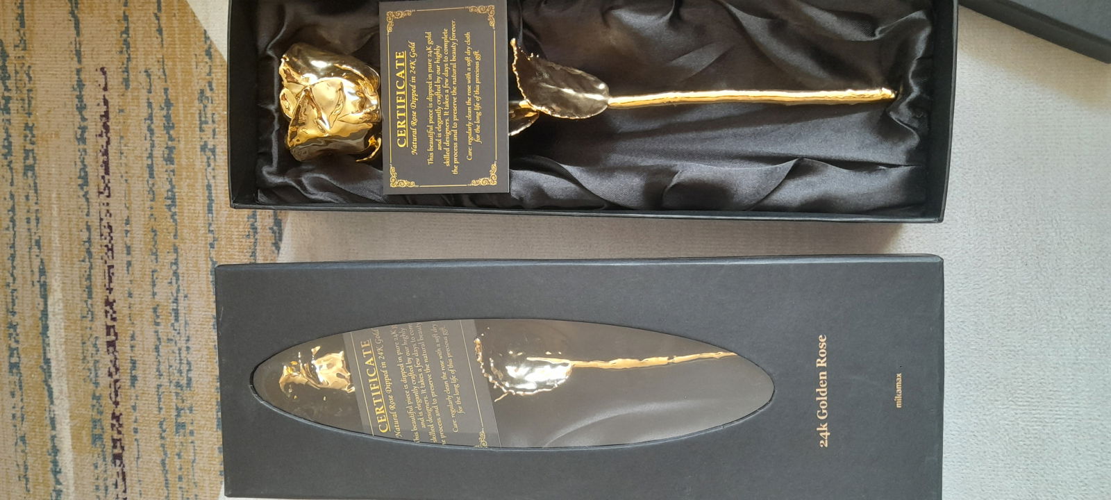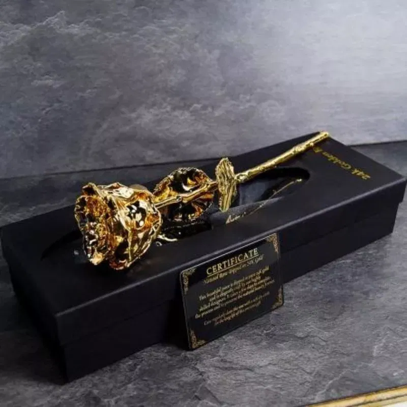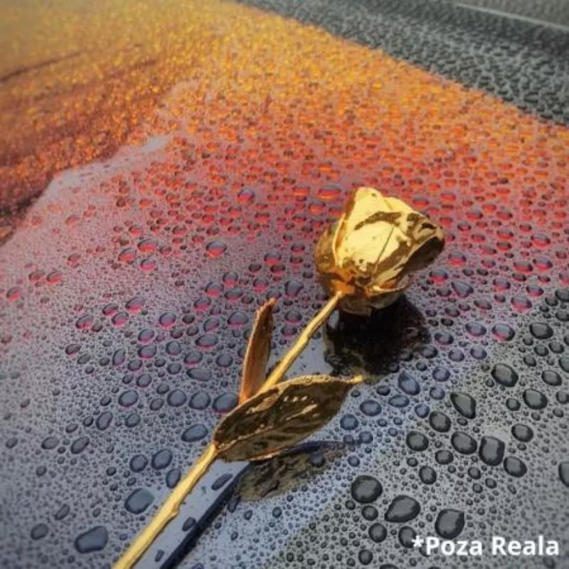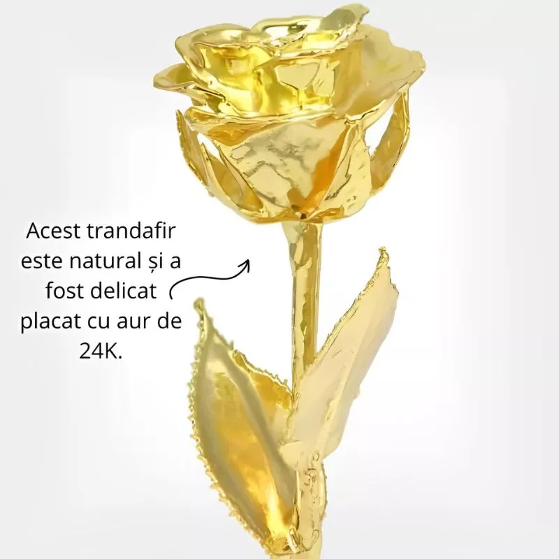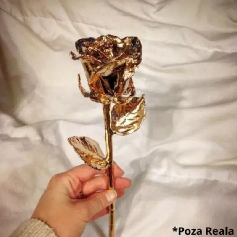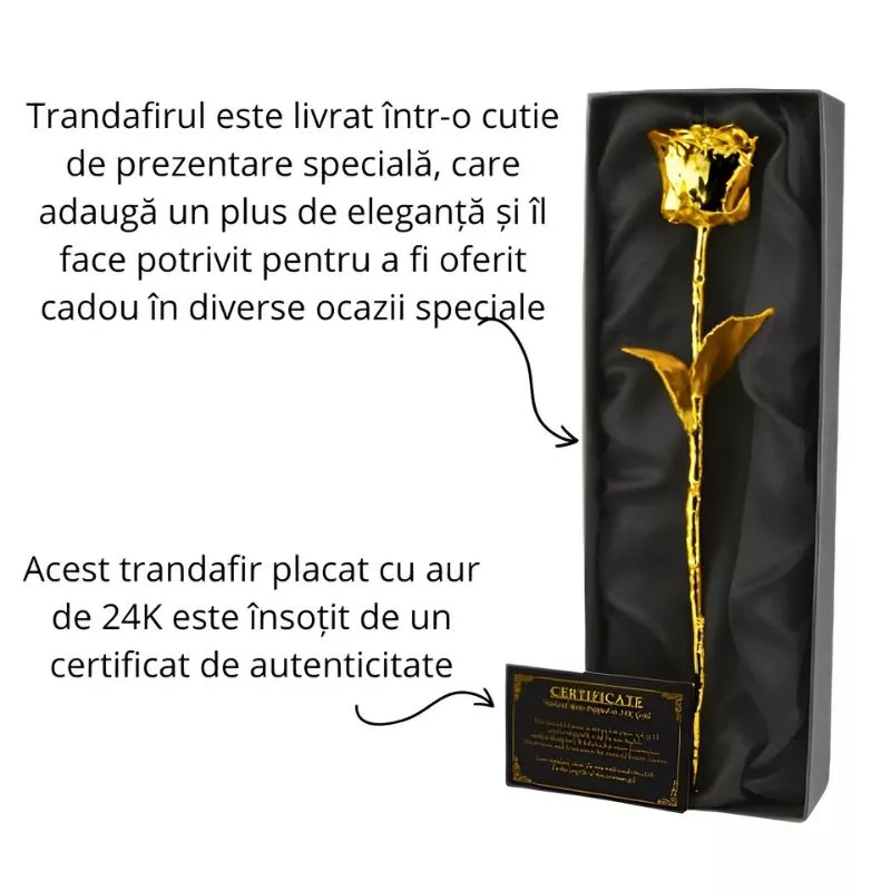 Imagineaza-ti un trandafir aur 24k perfect, decorat cu aur pur, un Trandafir placat cu foiță de aur ce-i imortalizeaza frumusetea, pentru a fi pastrat ca simbol al iubirii si daruirii. Trandafirul placat cu aur de 24K desavarseste o declaratie de iubire sau pur si simplu o privire care spune mai mult decat o mie de cuvinte. Eleganta, rafinament si bun-gust, toate reunite pentru a te ajuta sa iti exprimi sentimentele pentru femeia speciala din viata ta, este ambalat intr- o cutie stilata de culoare neagra, care evidentiaza frumusetea trandafirului. Alege sa o faci fericita, sa-i transmiti un mesaj puternic si sensibil cu acest trandafir aur livrat intr-o cutie de lux. Fie ca e o  zi de naștere, Craciun sau alta ocazie deosebita, impresioneaz-o! Oferim livrare avantajoasa direct la ea, asa ca poti sa-i faci o surpriza si de la distanta.