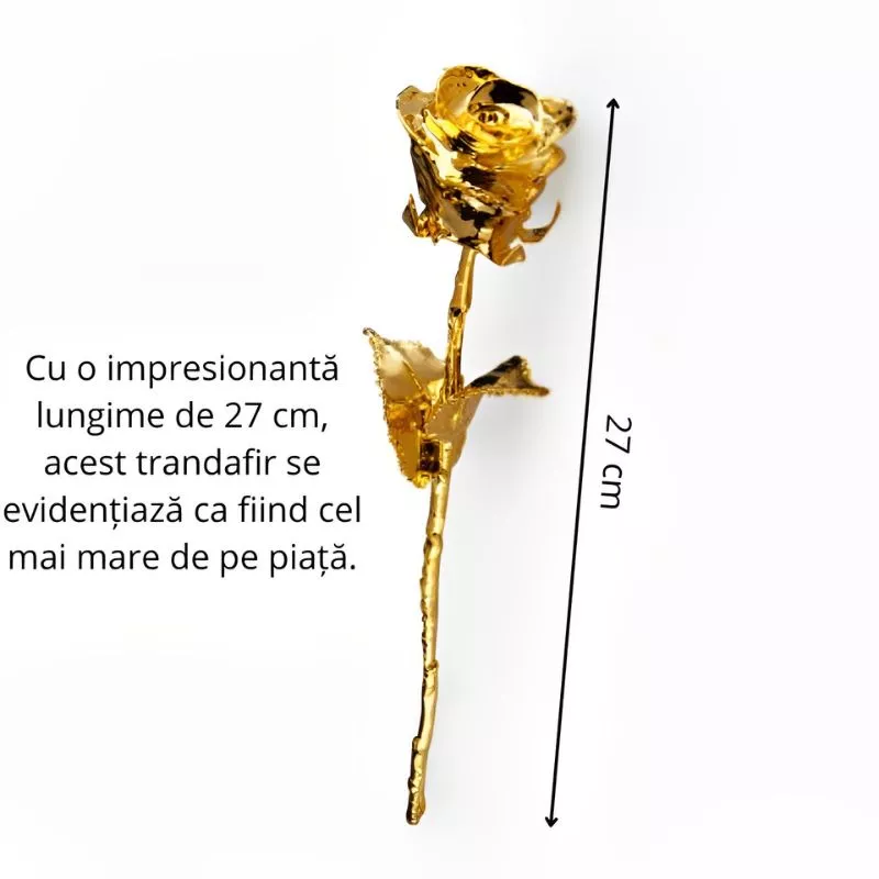 Acest trandafir din aur cu 24k are o lungime de 27 cm. Producatorul ofera si variante pornind de la 11 cm lungime, insa pentru ca stim ca dragostea e mare, noi aducem doar modelul cel mai mare, de 27 cm. Trandafirul de aur natural este placat cu aur de 24K, luand nastere o floare unica, eterna si sofisticata.