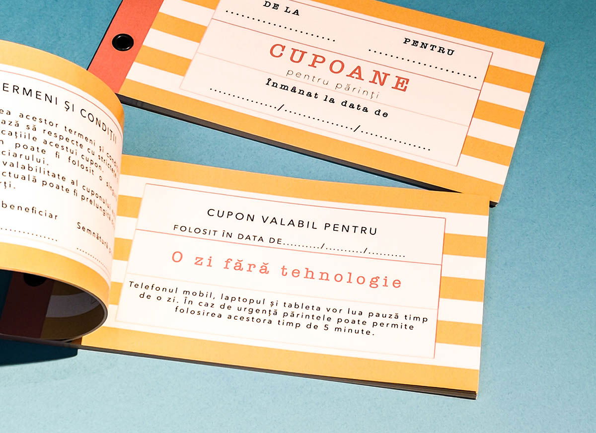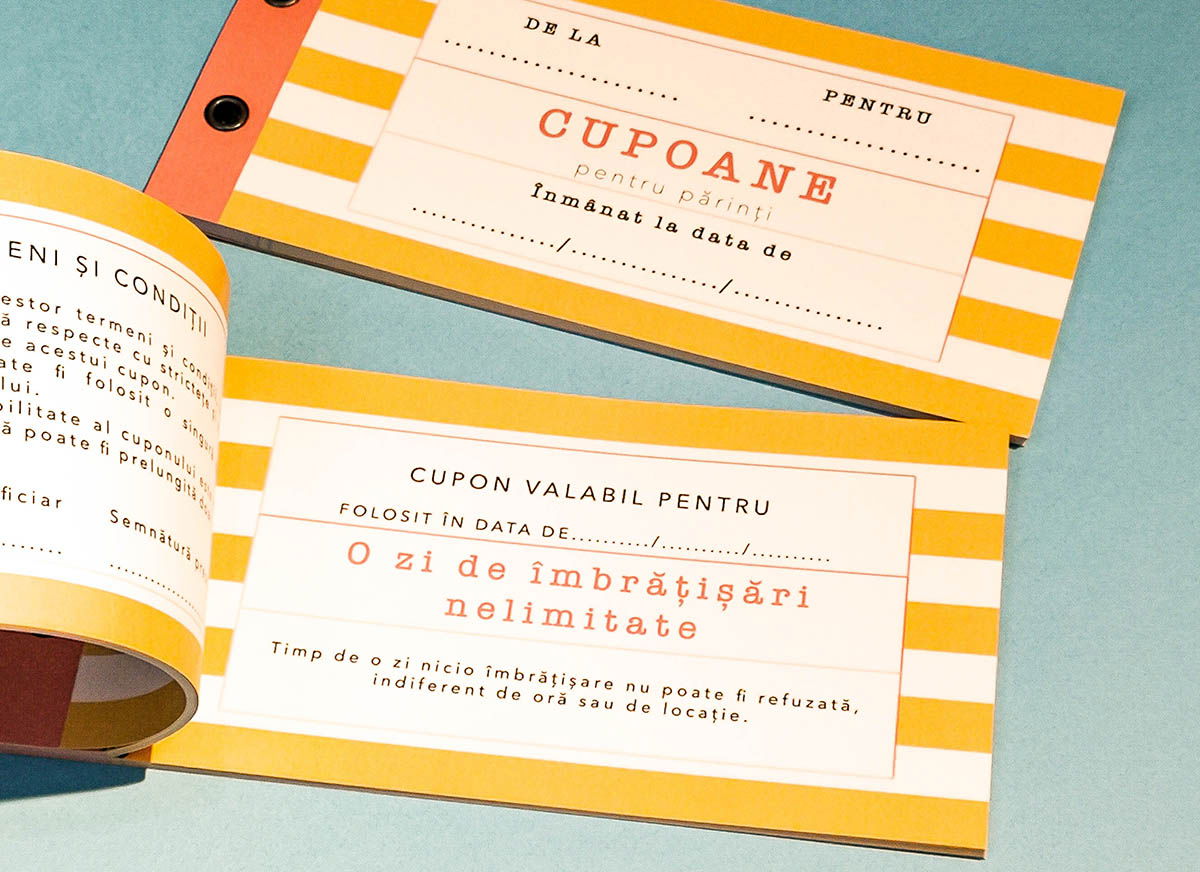 Regulile acestor Cupoane personalizate pentru parinti sunt simple: tu le oferi parintilor tai aceste cupoane si ei decid cum le vor utiliza. Sunt 20 de cupoane cu activitati realizabile, diverse si interesante, iar unul este gol si poate fi completat cum doresti tu (sau cum vor parintii tai). Pe spate gasesti termenii si conditiile pentru fiecare activitate, pentru ca totul sa para cat mai formal cu putinta. Cei doi le vor putea semna inainte de a duce la indeplinire indicatiile de pe cuponul ales.