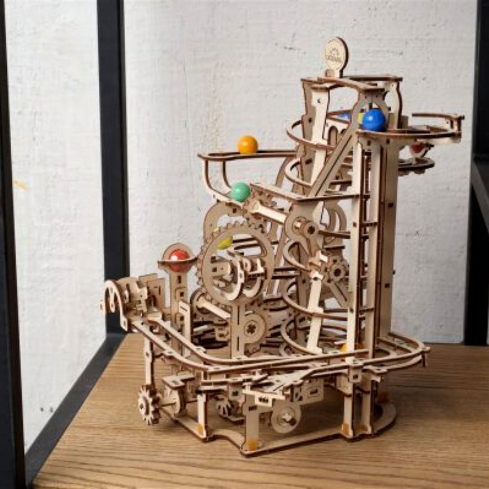 Distractia cu bilele continua cu Puzzle-ul 3D Marble Run Spiral Hoist din lemn, Ugears, al patrulea dintr-o serie de piste modulare Ugears. Acest model este atat un puzzle 3D, cat si o jucarie distractiva. Marble Run are o pista in forma de spirala fascinanta. Rotiti manivela pentru a ridica bilele de marmura colorate (o biluta se ridica la noua rotatii ale manivelei de infasurare) pana la depozitul de trei bille de sus. De acolo, bilele isi incep cursele de coborare prin elemente interesante: un tobogan de mare viteza, un sarpe vertical si un rau de munte.