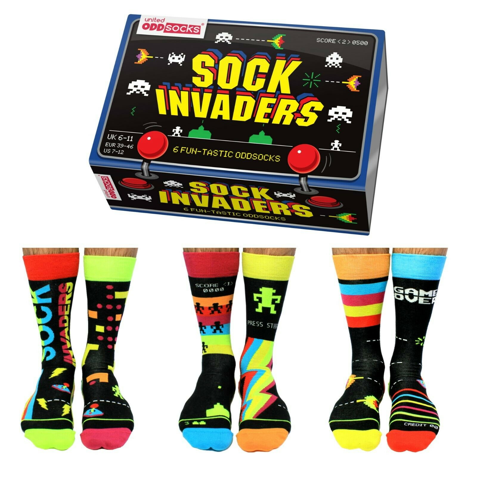 Multumita acestui set 6 sosete colorate Fun-Tastic Sock Invaders care le-a permis sa joace in voie si sa provoace adversarul, dar si sa-l invinga prin cele mai nastrusnice tactici si cel mai important, fara pic de efort. Bineinteles, e nevoie de multa concentrare, dar numai cat le iei la purtator in locul de cinste ti se va deschide si al 5-lea ochi. Iar imprimeul retro va reusi inclusiv sa-ti ofere o vacanta in trecut.