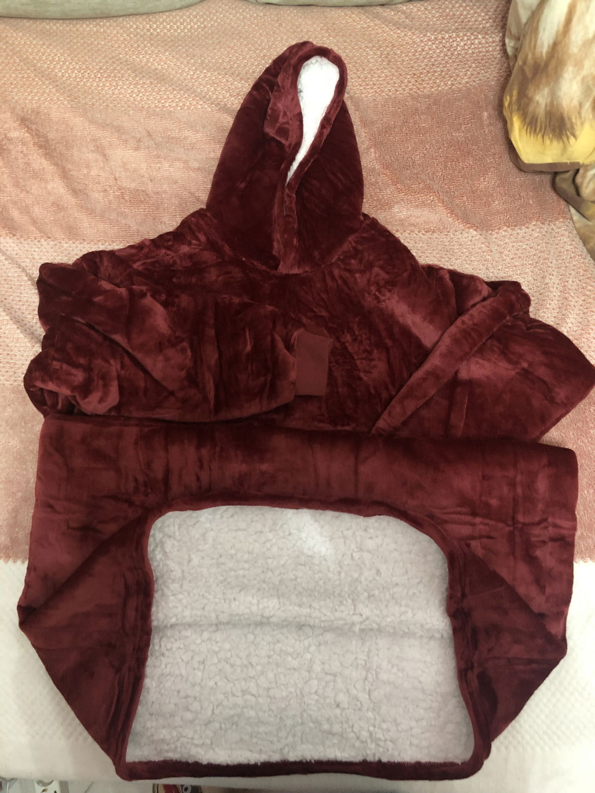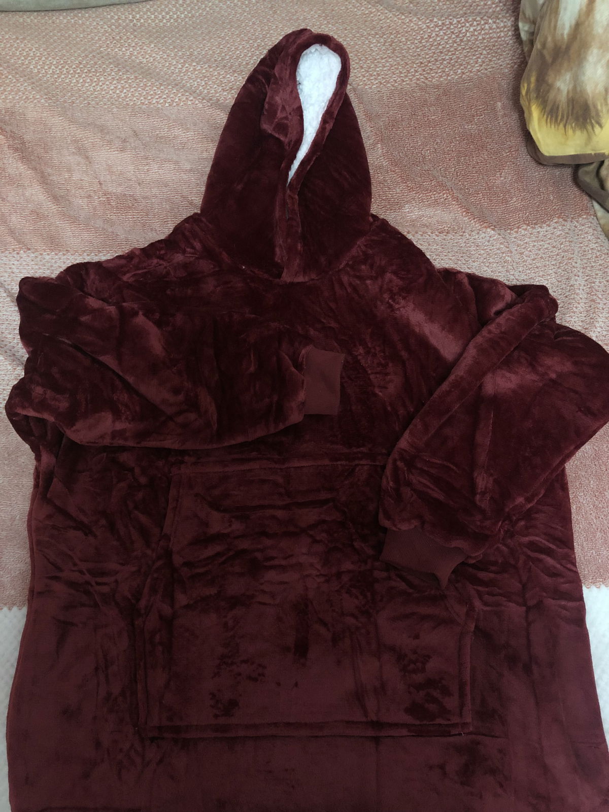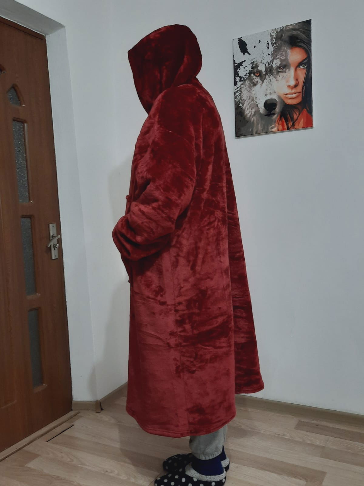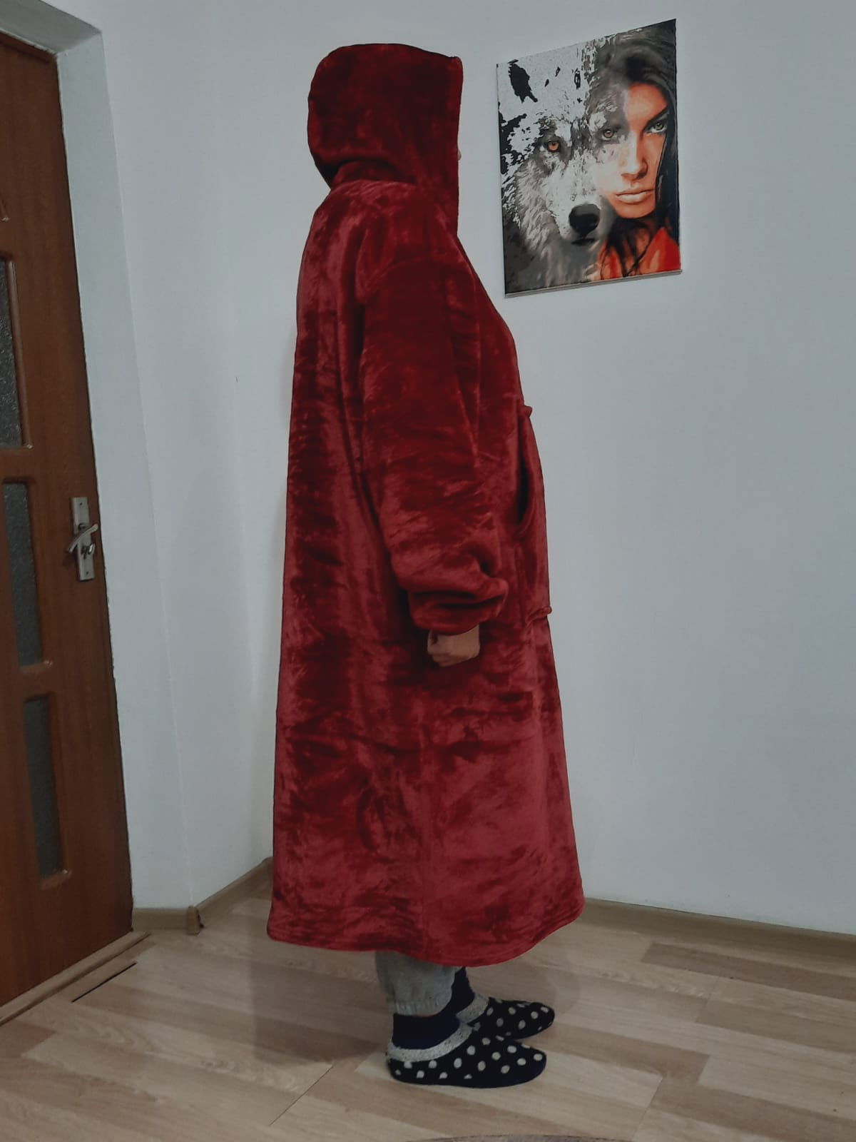 Hanorac patura cu maneci, gluga si buzunar cangur, Flanel & Polar, 480g/mp, 165 cm, Rosu, da dependenta prin confortul prelungit pe care-l ofera in timpul zilelor friguroase cand trebuie sa opresti centrala caci te-au dat facturile peste cap.