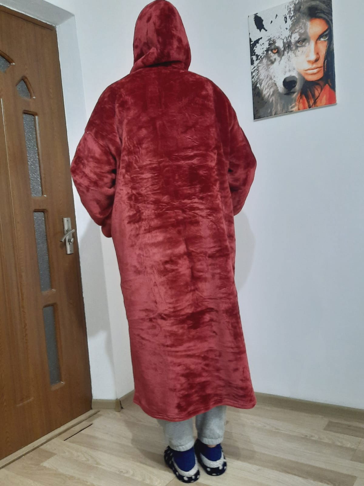 Dispune si de o gluga cu dimensiunea de 35 cm care sa protejeze chiar si extremitatile, iar inaltimea de la umar in jos este de 130 cm. Manecile de 70 cm au o manseta elastica pentru o potrivire la orice silueta, chiar si la cele mai generoase, deci iti ascund inclusiv kilogramele in plus. Buzunarul central tip cangur stie ca pofta ta creste in timp ce citesti o carte sau vezi un film, asa ca-ti permite sa-ti faci stoc cu multe gustari sau iti pastreaza accesoriile necesare la indemana.