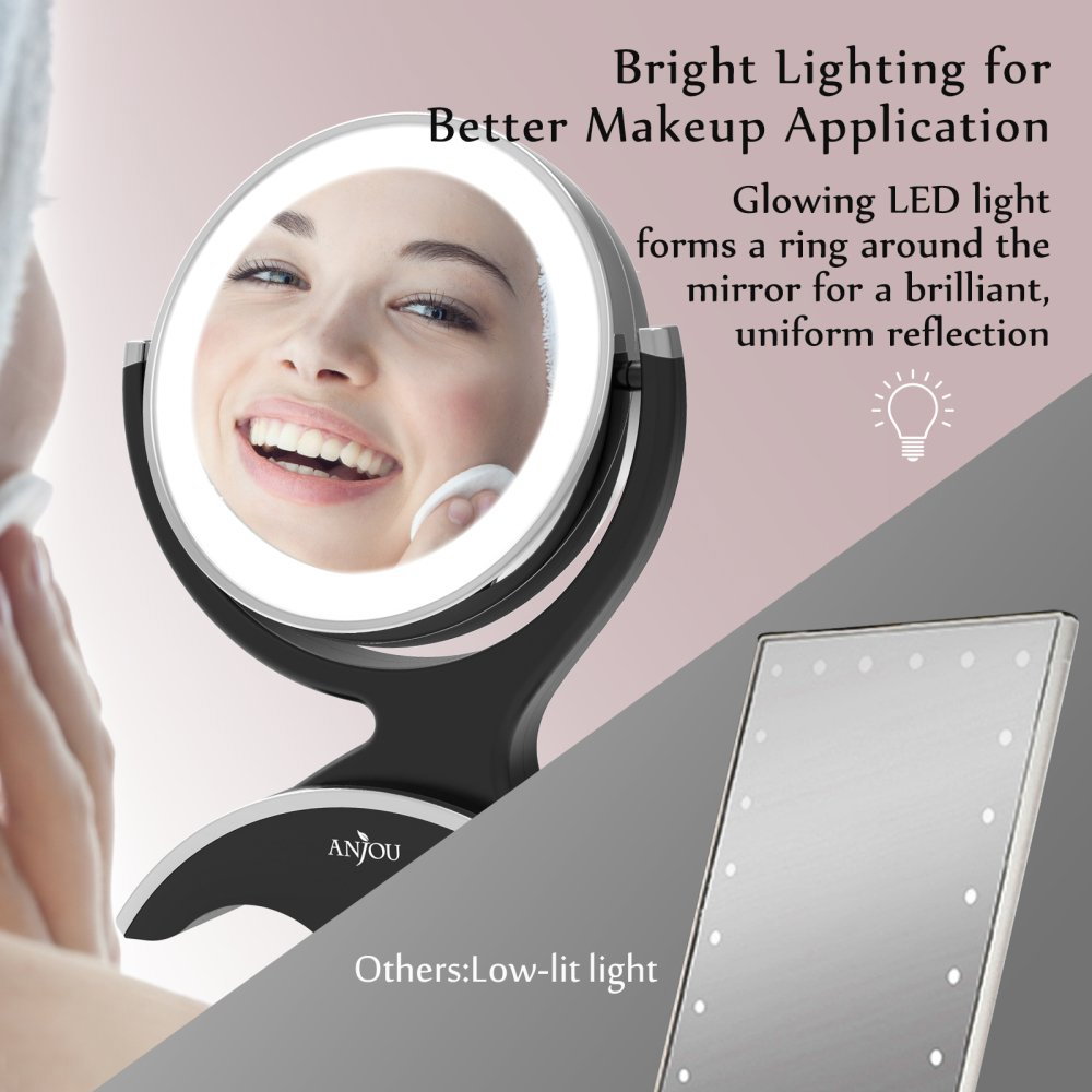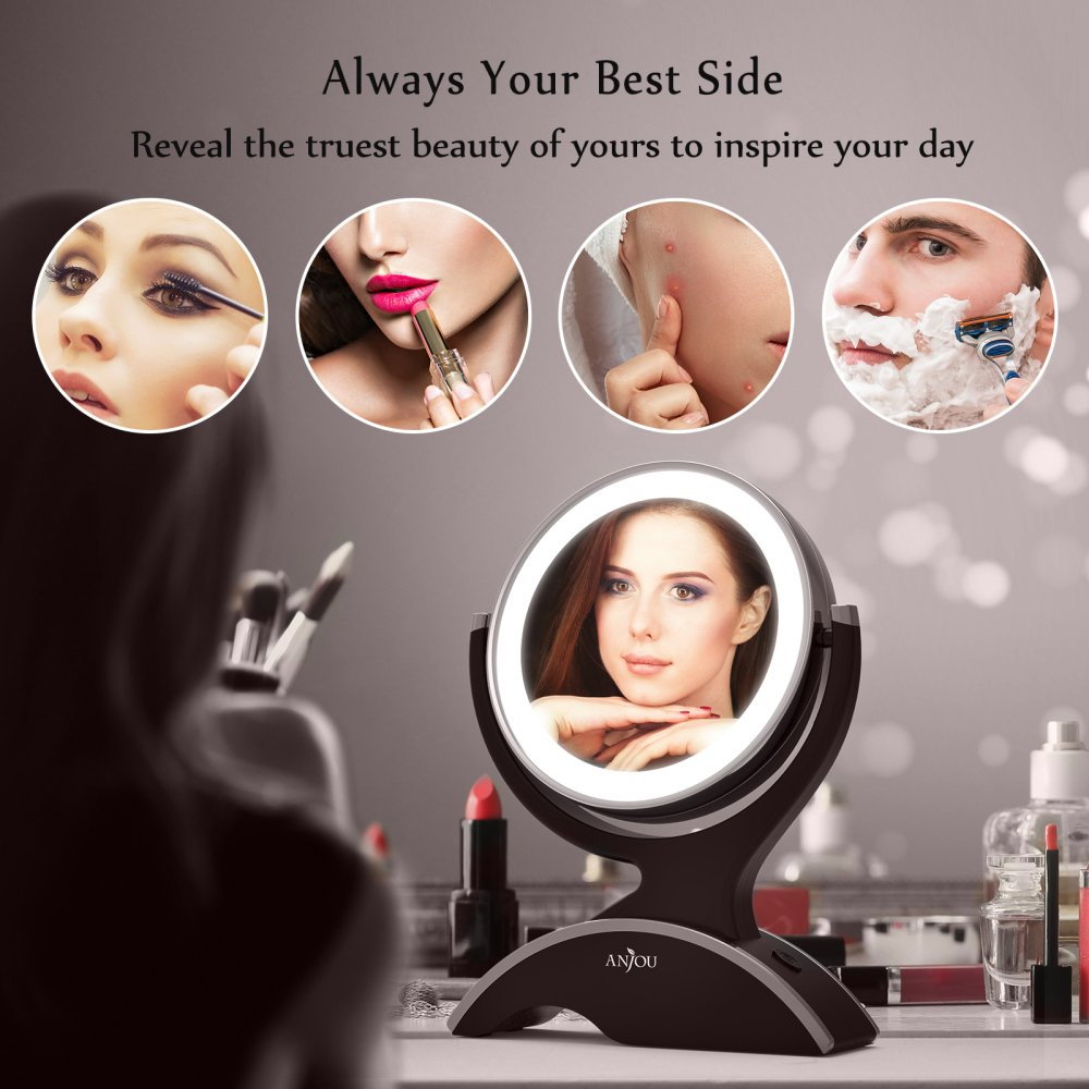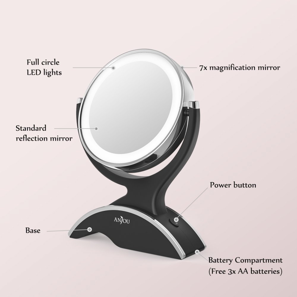 Utilizare: Pachetul contine 3 baterii, astfel nu mai ai nevoie de nimic in plus pentru a utiliza produsul. Oglinda machiaj Anjou iluminata LED, 2 fete, Marire 7X este unul din cele mai frumoase cadouri pentru femei.