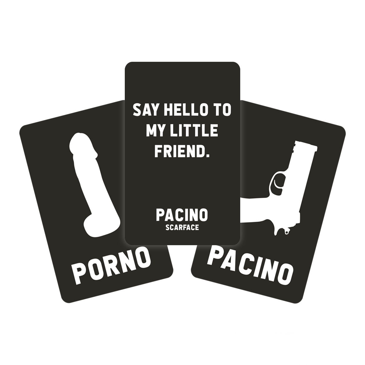 Porno Or Pacino, joc traznit este o alegere pe care s-o incerci cel putin o data in viata. Jocul pune imaginatia si memoria la contributie, in timp ce cartonasele non-conformiste vin sa te surprinda si sa te umple de lacrimi si hohote. Nu uita si servetelele!