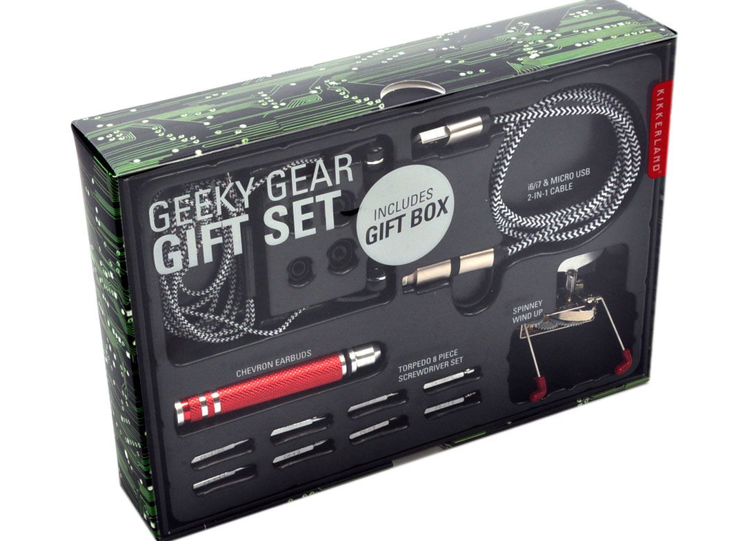 • Set cadou Geeky Gear este cadoul perfect pentru iubit sau sot • Compact si gata de a fi luat aproape oriunde, acest Geeky Gear Gift Set iti permite sa iti transporti toate gadgeturile si accesoriile cu usurinta • Acest set de instrumente se transforma intr-un cadou cat ai clipi • Tot ce trebuie sa faci este sa scoti ambalajul din plastic si partea de jos a ambalajului sa vina in locul sau • Trusa contine: casti audio Chevron, o surubelnita 8 in 1, un cablu microusb 2in1 (i6-i8) si un Spinney Wind-Up