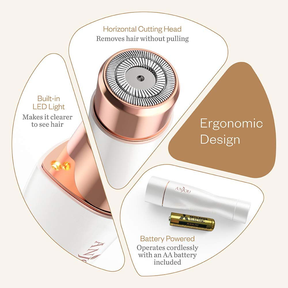 Cap de taiere orizontal Trimmer facial femei Anjou AJ-PCA014: Cu ajutorul capului de taiere orizontal, aparatul de tuns permite alunecarea pe fata si inlaturarea parului fara a-l trage din radacini. Intregul proces de eliminare a firelor de par inestetice de pe fata si maini decurge rapid si fara durere.