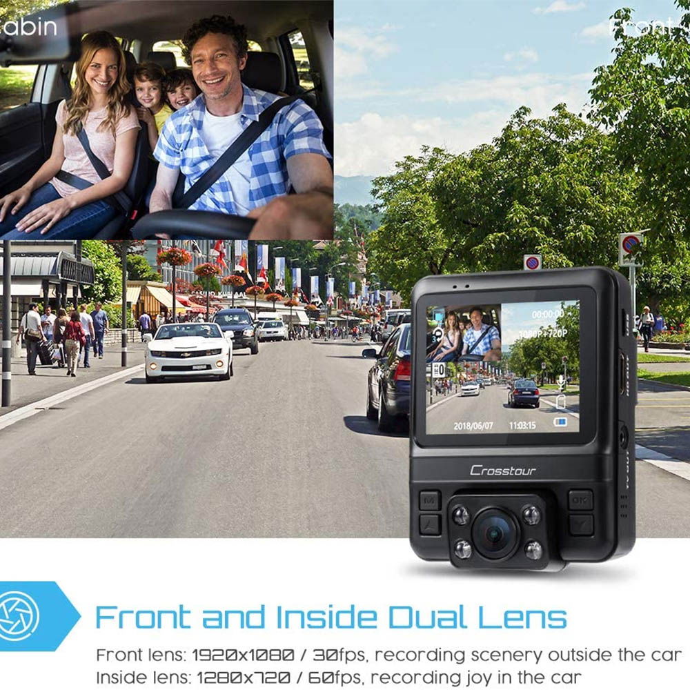 Lentile dubla fata si interior: Modelul Crosstour CR750 integreaza o lentila dubla in acelasi corp ce permite inregistrarea la o calitate Full HD 1080p la exterior cu un unghi de vizibilitate crescuta pana la 170°. La interior camera filmeaza la o calitate HD 720p. Camera poate inregistra simultan frontal si in interiorul masinii. Este o camera ideala pentru taximetristi, dar si pentru a inregistra momentele haioase petrecute in masina alaturi de familie.