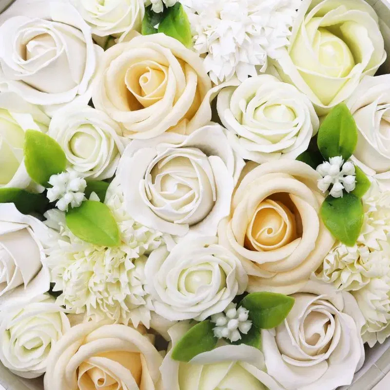 Fiecare floare este meticulos realizata pentru a se asemana cu florile naturale, avand culori delicate de ivory si detalii realiste. Acest aranjament floral este perfect pentru a fi folosit atat ca decor, cat si ca sapun parfumat, oferind un element de lux si functionalitate.