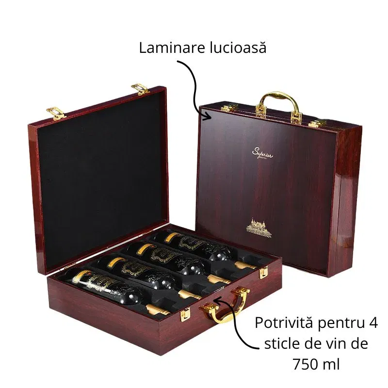 Pregateste-te sa aduci bucurie in vietile celor dragi, caci am pregatit un cadou spectaculos - Cutia de vin XL Wood Deluxe, pentru 4 sticle. Am numit-o cu mandrie "Grandeur" (si nu eram sub vraja vinurilor... inca). Gandeste-te la pasionatii de vin, cei care stapanesc tainele aromei si indraznesc sa savureze un Chateau Margaux sau un Brunello di Montalcino, cu toate nuantele lor subtile si distincte. Ei, prietenii astia ai tai vor fi coplesiti de acest cadou sofisticat, care le va imbunatati experienta in degustari.