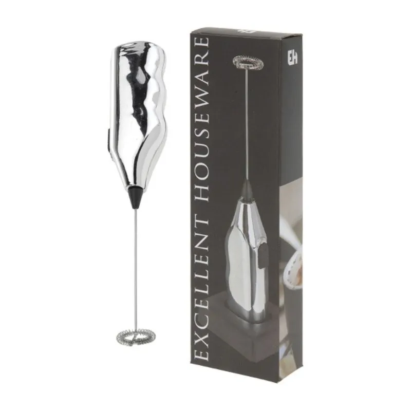 Mixerul Spumator de Lapte este realizat din metal si otel inoxidabil, cu un design cromat elegant. Cu dimensiuni compacte de 4 x 20 x 3 cm, acest mini mixer manual functioneaza pe baterii (2 x AA, neincluse). Usor de utilizat, insa nu este potrivit pentru masina de spalat vase.