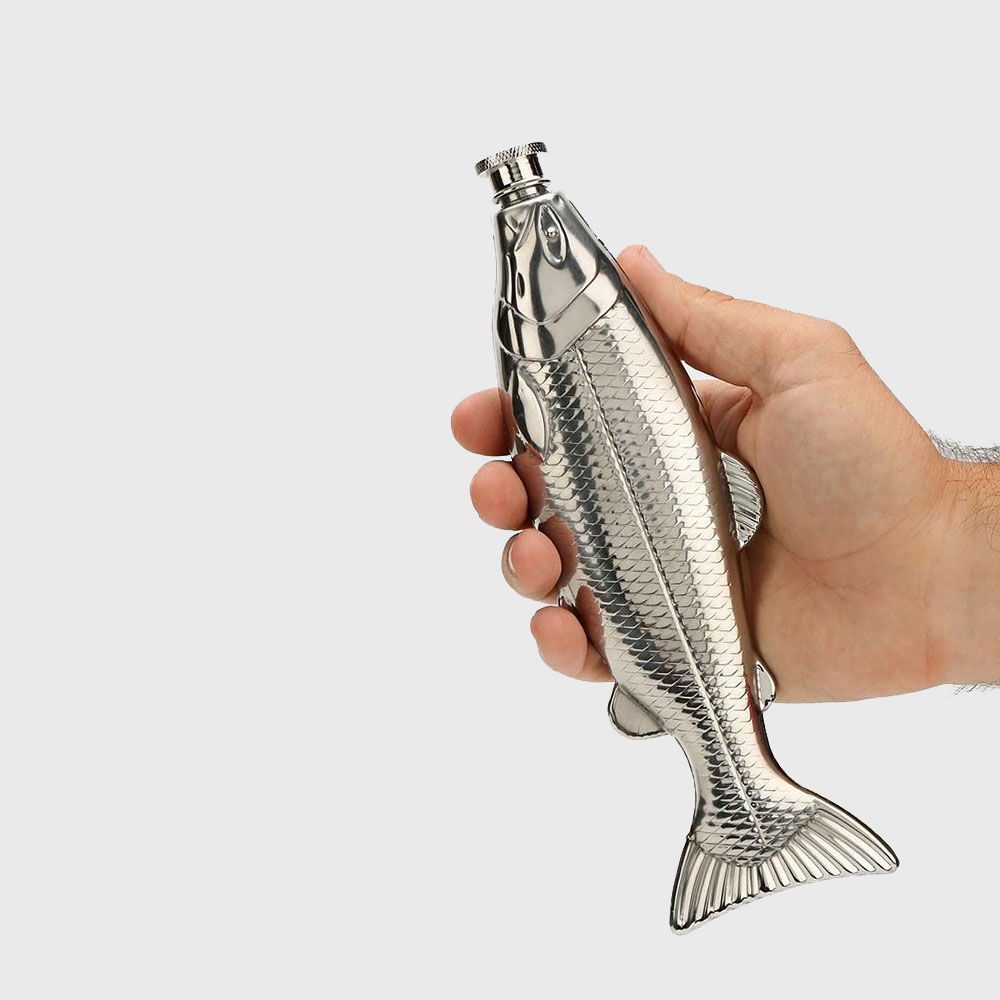 De aceea, Plosca pestisorul promite curaj vine sa inlocuiasca intr-o varianta tematica, previzibila sticluta de plastic. Se incadreaza perfect in relief si camufleaza intentiile utilizatorului (doar atunci cand e cazul). Cine poate banui ca un pescar veritabil duce in pestele metalic din buzunar bautura sa preferata? Insa nu putem garanta ca ceilalti colegi pescari nu vor fi invidiosi.