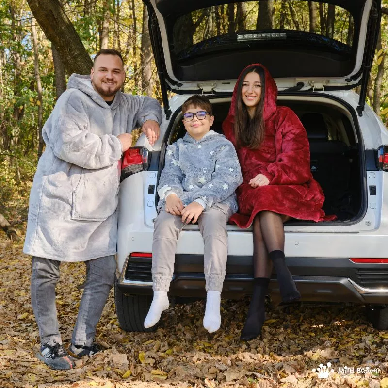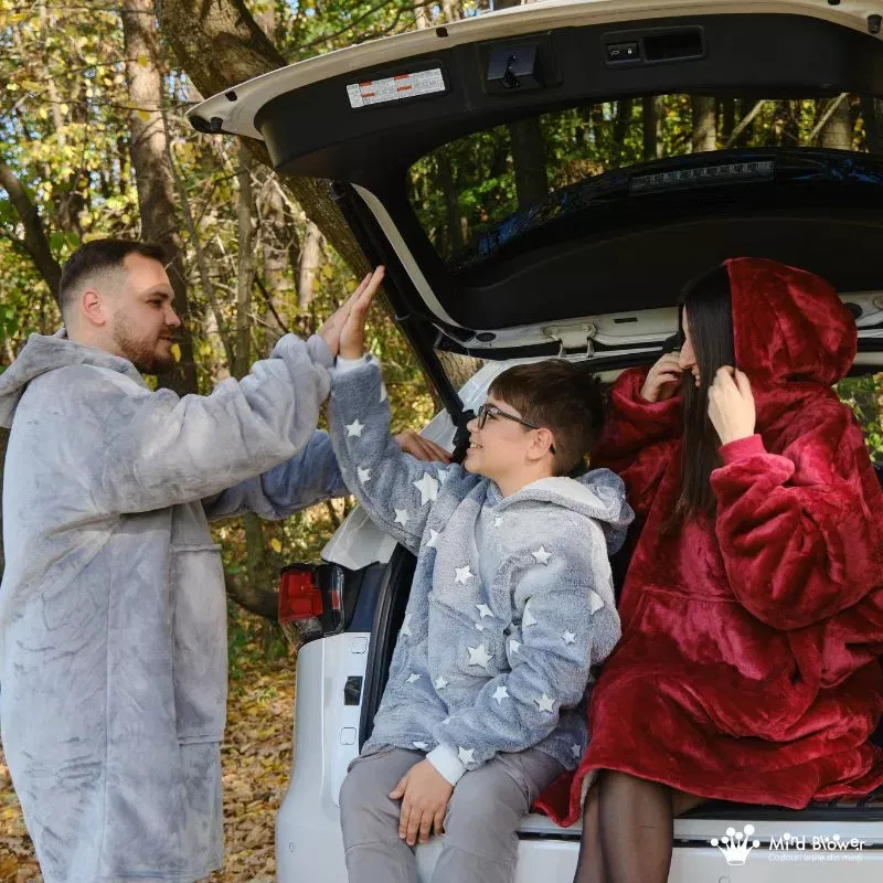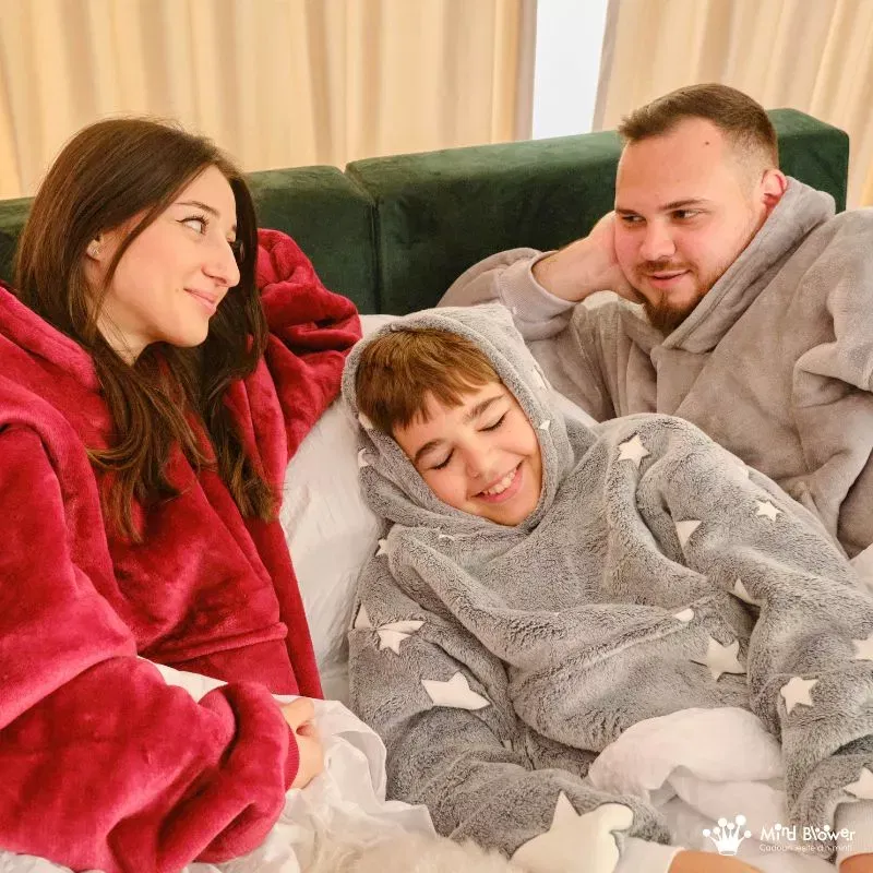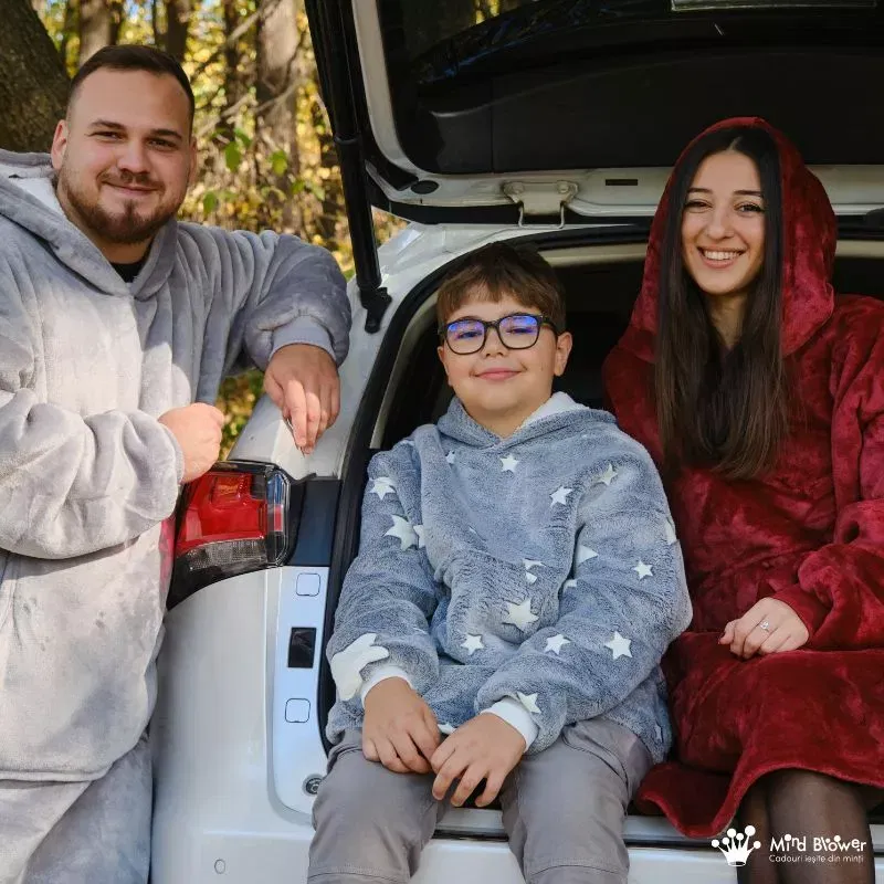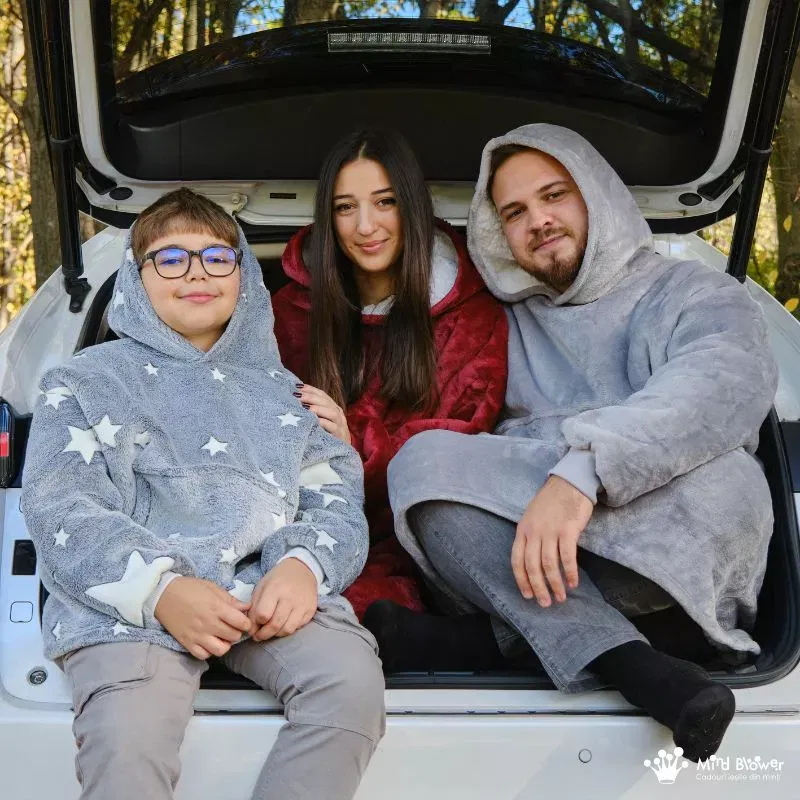 Zilele reci devin cu adevarat speciale cu Setul de 3 Paturi cu Maneci Mama, Tata si Fiul. Fiecare hanorac patura cu maneci este o imbratisare calda si plina de iubire, subliniind legatura stransa dintre membrii familiei.