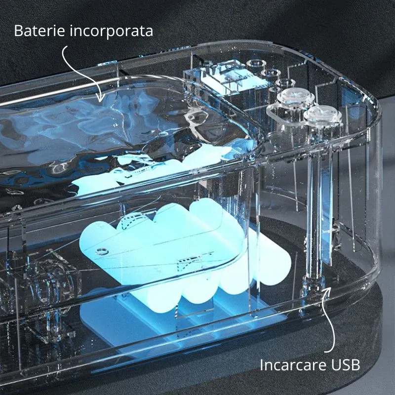 Este dotat cu incarcare USB si functionare silentioasa, fiind ideal atat pentru acasa, cat si pentru utilizare profesionala. Capacul elegant previne stropirea si ajuta la mentinerea apei curate.