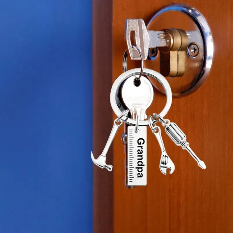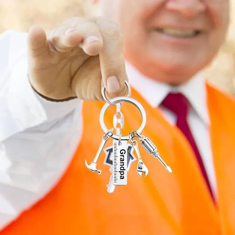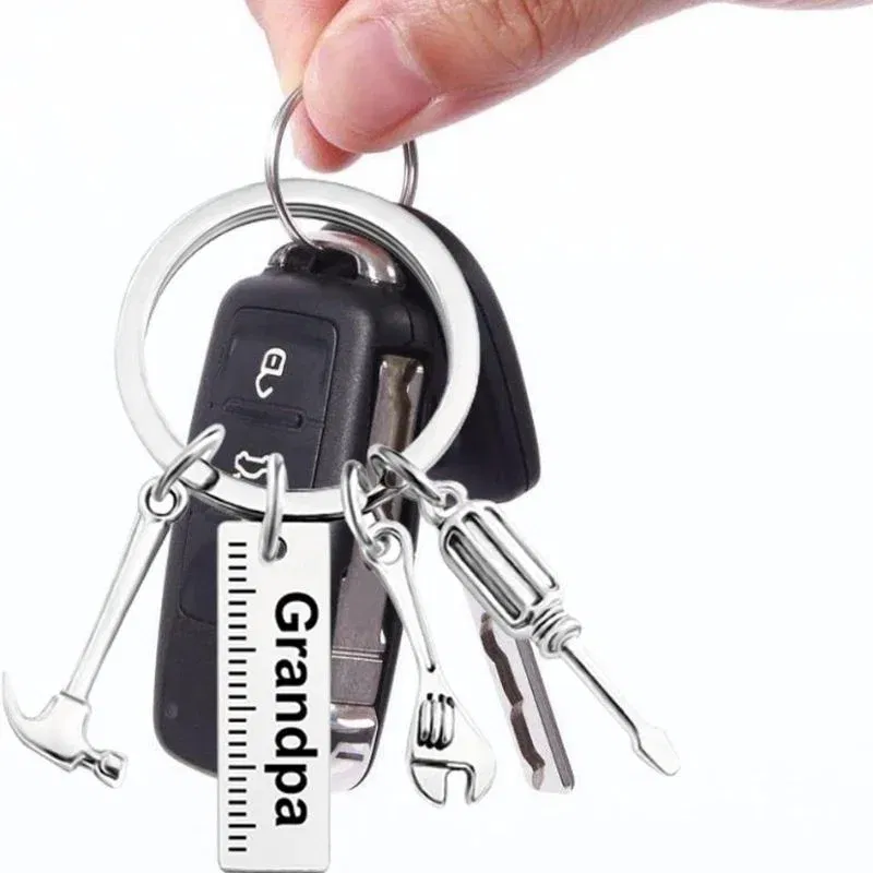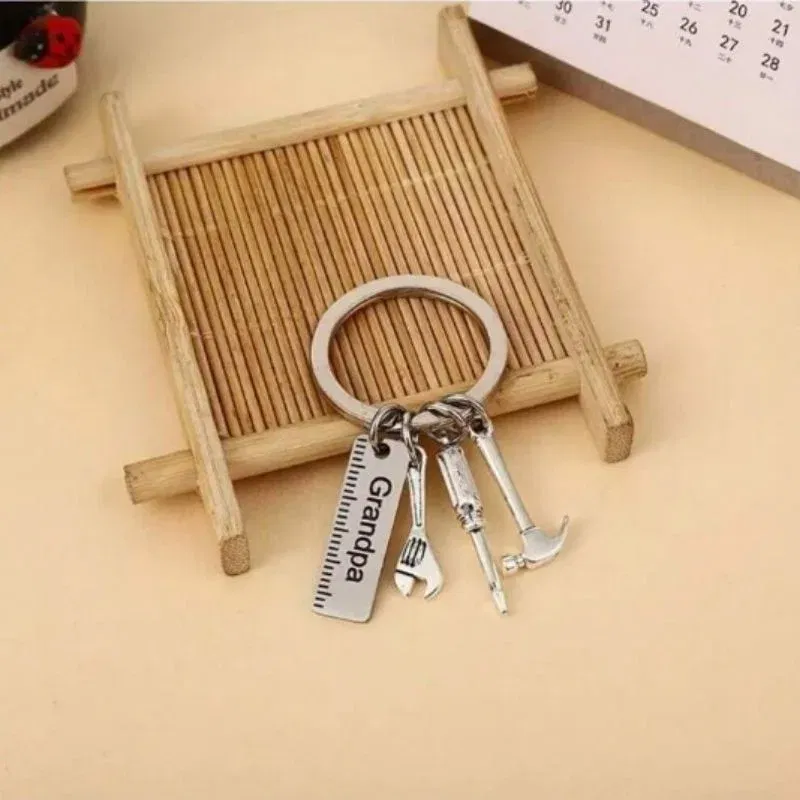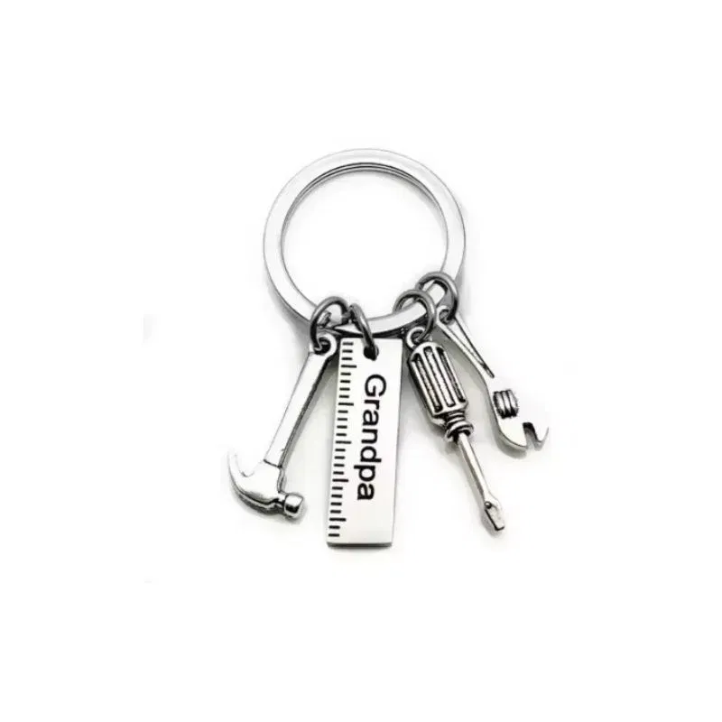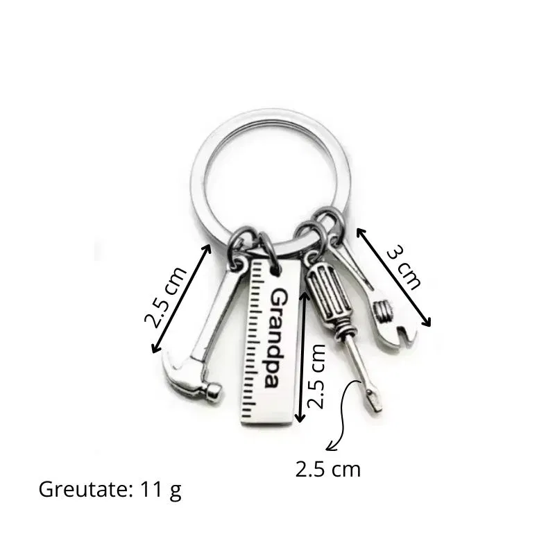 Format dintr-un inel metalic rezistent si 5 mini-unelte (ciocan, surubelnita, cheie franceza, cheia fixa si o rigla inscriptionata „Grandpa fix it!”), acest breloc este o combinatie perfecta intre util, haios si simbolic.