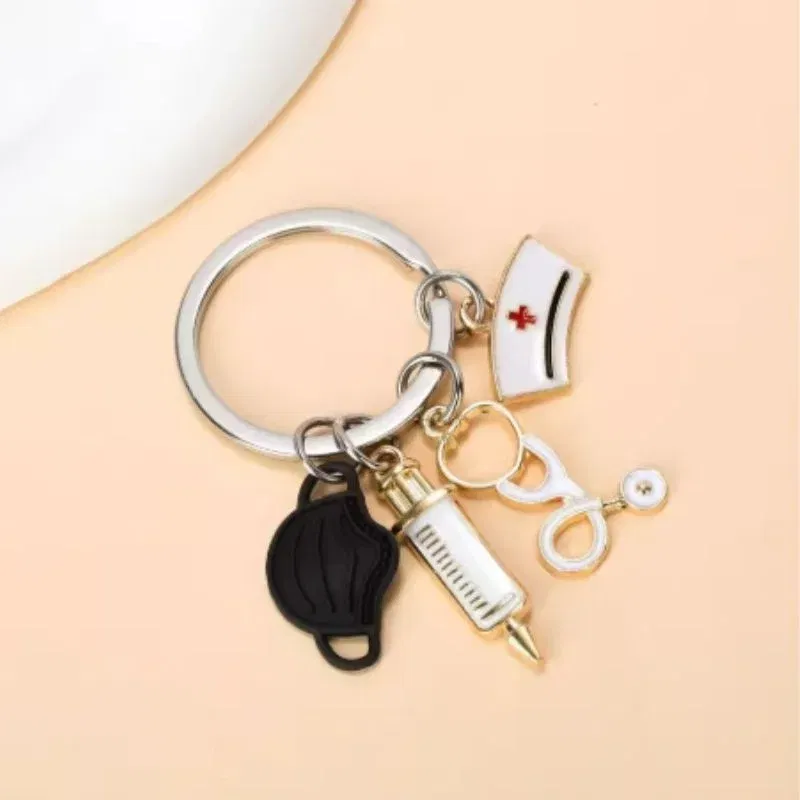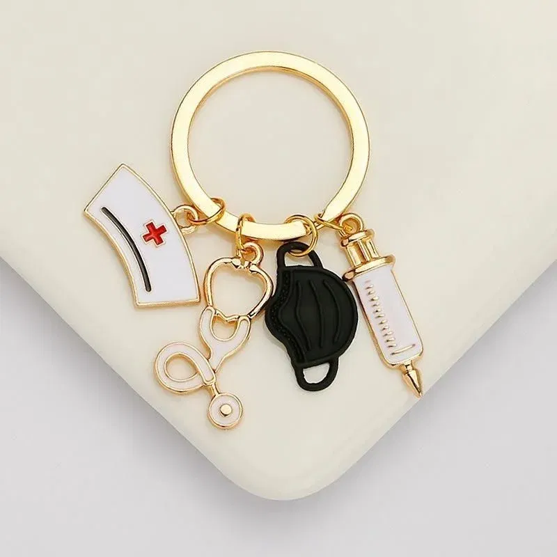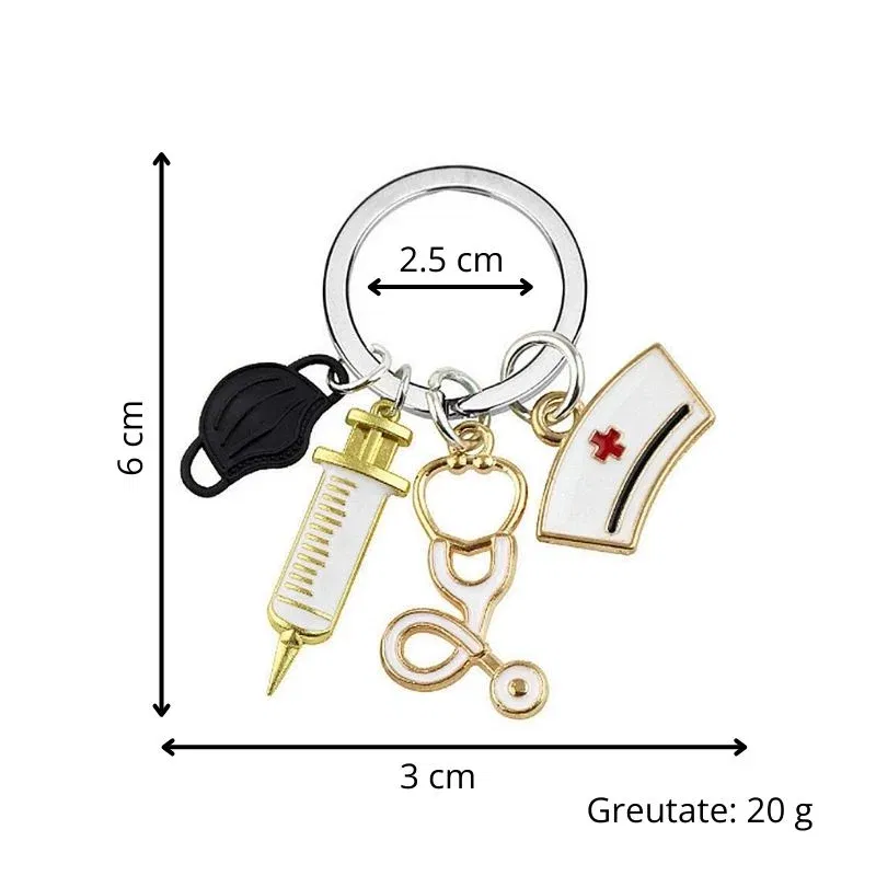 Designul include miniaturi atent realizate: o seringa aurie, un stetoscop, o boneta medicala si o sapca de asistenta cu cruce rosie – toate atarnate elegant pe un inel metalic rezistent. Este un breloc usor, colorat subtil si potrivit pentru orice tip de chei, geanta sau rucsac.