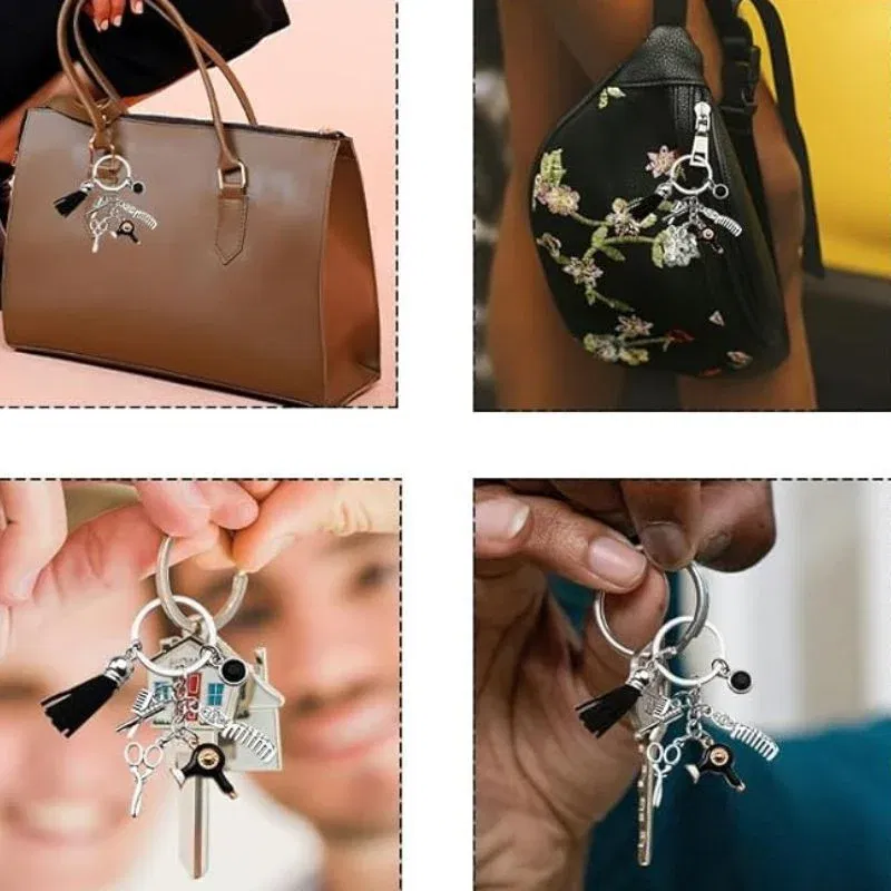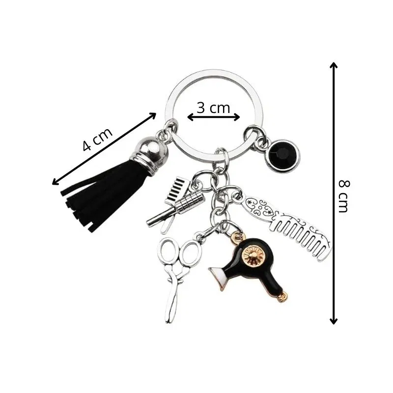 Brelocul hairstylist „Stil la purtator” este un cadou adorabil si simbolic pentru toate persoanele care traiesc in lumea coafurilor, frizeriilor si transformarilor spectaculoase. Include miniaturi atent lucrate ale uneltelor esentiale din viata unui stilist: foarfeca, pieptene, uscator de par, si charm-uri aditionale precum o ciucure negru si o piatra decorativa.