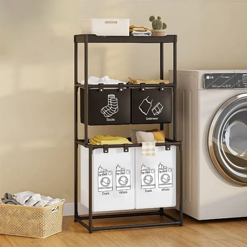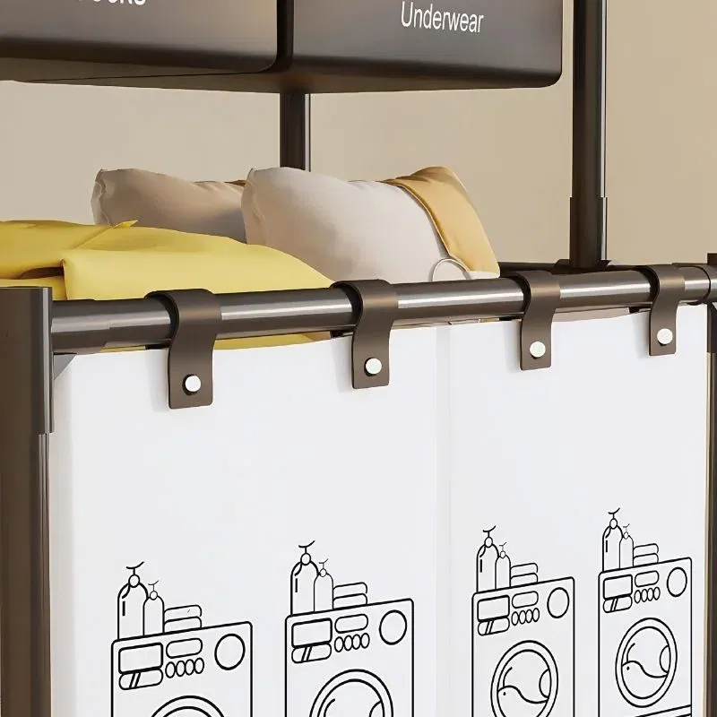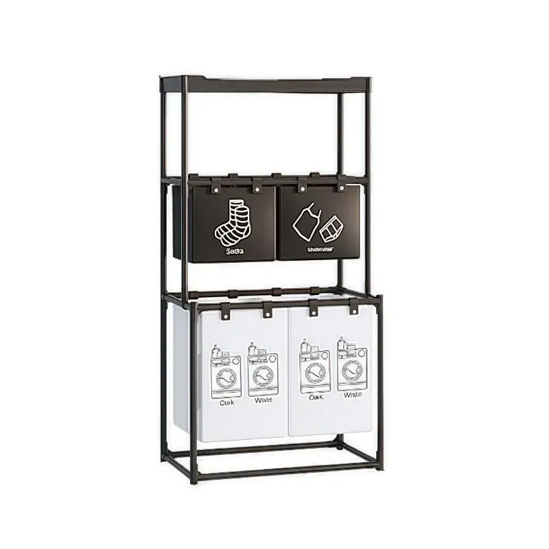 Utilizare: Se monteaza simplu si devine rapid centrul de comanda pentru rufele tale. Compartimentele textile te ajuta sa sortezi hainele din start, iar raftul de sus iti tine la indemana tot ce folosesti la fiecare spalare.