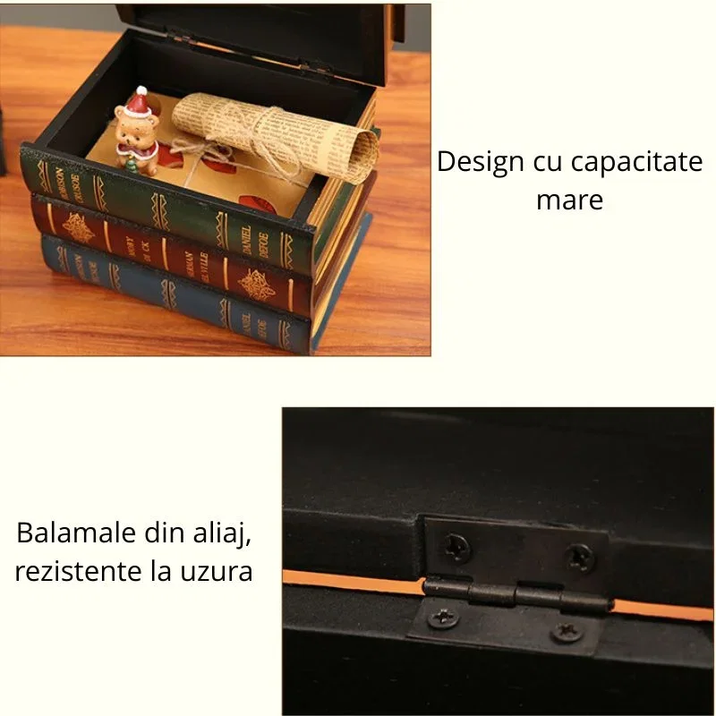 Realizata din materiale de calitate, cutia combina structura din lemn cu un finisaj exterior din piele ecologica, oferind atat rezistenta, cat si un aspect premium. Textura este placuta la atingere, iar detaliile decorative sunt atent realizate pentru a crea un efect autentic de carte vintage. Este un produs care imbina estetica cu functionalitatea.