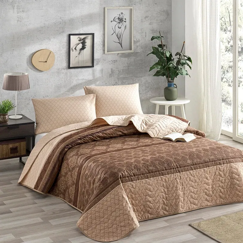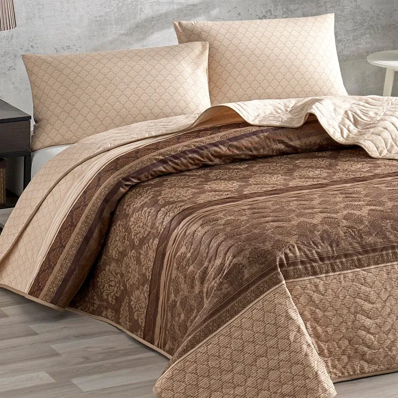 Completeaza decorul dormitorului tau cu aceasta cuvertura matlasata Creative in nuante de maro si maro inchis. Designul elegant si textura matlasata transforma orice pat intr-un spatiu sofisticat si confortabil, ideal pentru relaxare si odihna. Fabricata dintr-un mix de 65% bumbac si 35% poliester, aceasta cuvertura combina finetea bumbacului cu rezistenta poliesterului. Materialul este respirabil si placut la atingere, oferind un confort sporit pe durata intregii nopti.