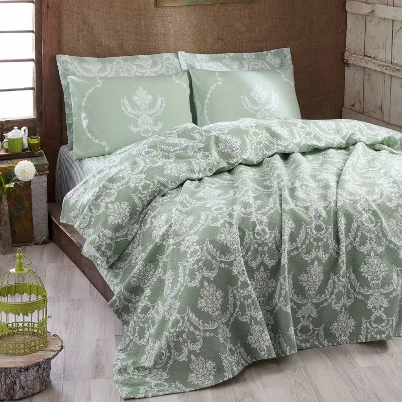 Datorita materialului de calitate si texturii piqué de 280 g/mp, cuvertura este placuta la atingere si rezistenta in timp. Nuanța de verde marin aduce o senzatie de prospetime si relaxare, creand un ambient placut si linistitor in camera.