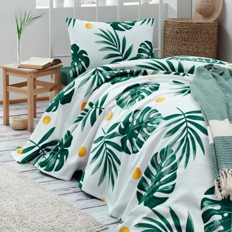 Fabricata din bumbac pique 100%, aceasta cuvertura ofera o senzatie placuta la atingere si un confort termic optim. Modelul tropical, cu frunze Monstera si accente in nuante de galben si verde, transforma orice pat intr-un element decorativ elegant.