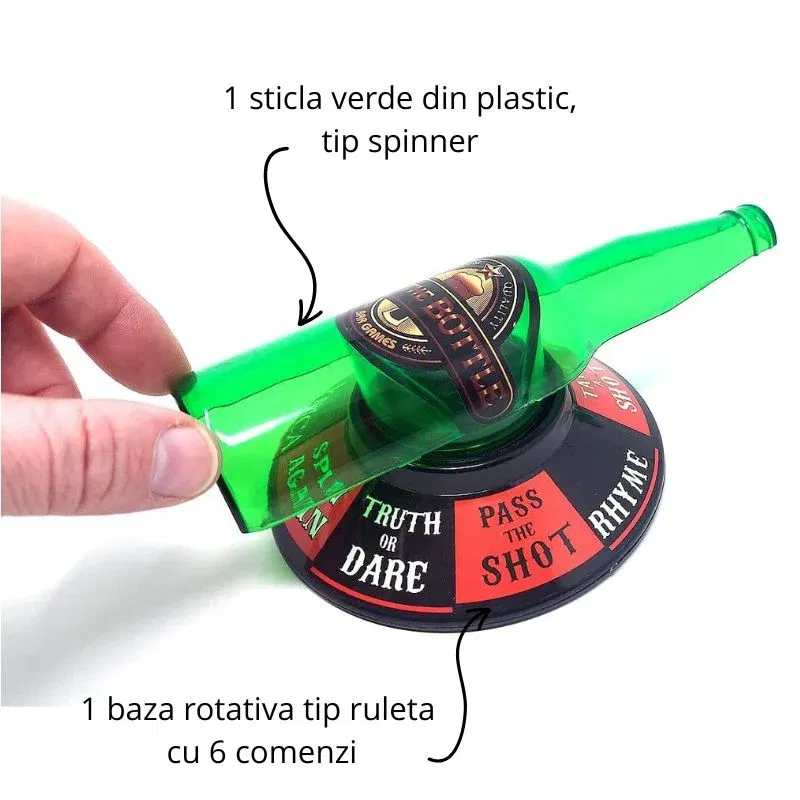 Jocul include o sticla rotativa montata pe o baza cu inscriptii sugestive – „Bea 2 shoturi”, „Paseaza shotul”, „Adevar sau provocare” si multe altele. Este ideal pentru a sparge gheata intr-un grup nou, pentru a anima o petrecere sau pentru a transforma o seara obisnuita intr-un moment de ras garantat. Fiecare rotire e o surpriza, iar nimeni nu scapa!
