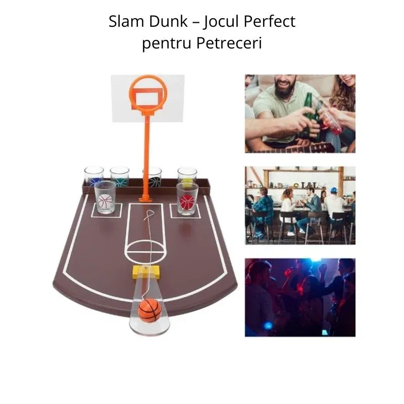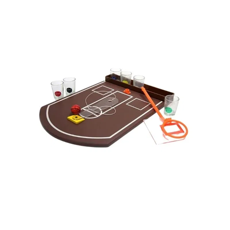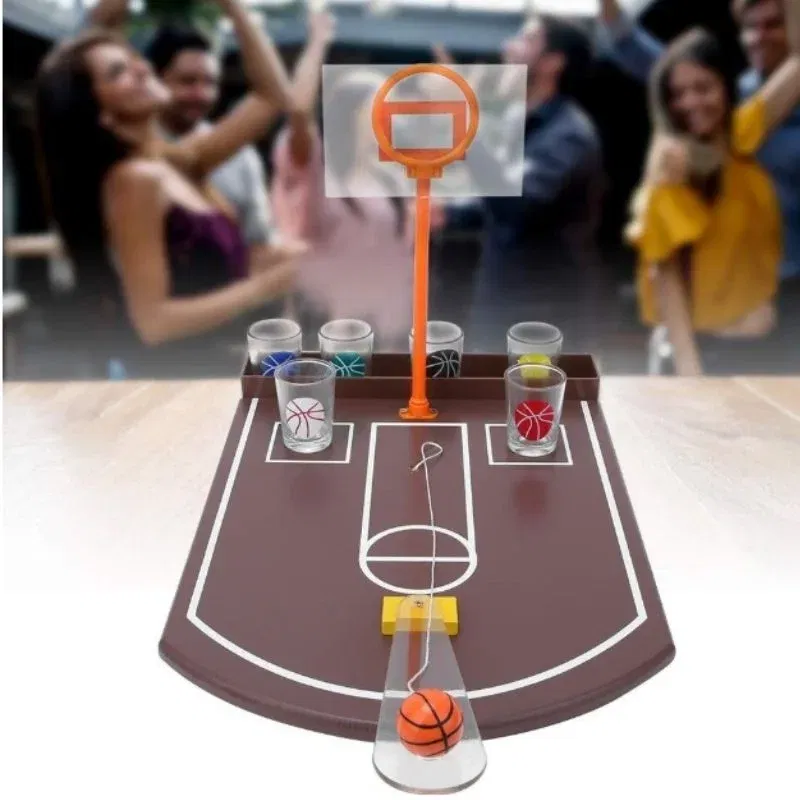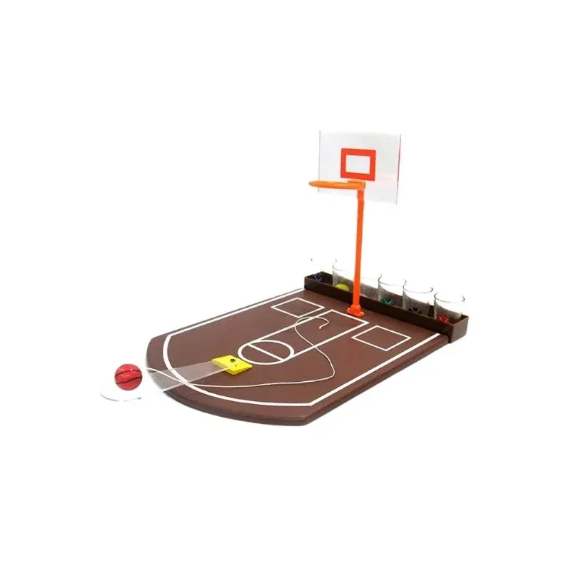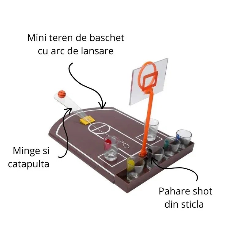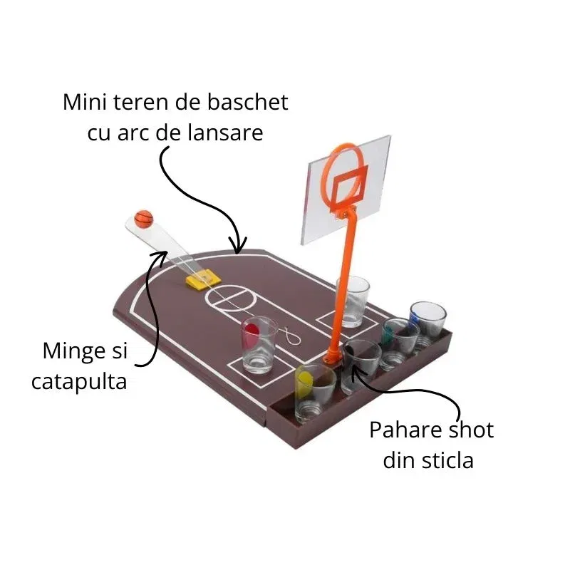 Monteaza jocul pe masa, umple paharele cu bautura si incepe provocarea! Fiecare jucator are cate o sansa sa marcheze cosul cu ajutorul lansatorului. Cine rateaza, bea. Cine inscrie, scapa. Poti adauga si reguli personalizate pentru mai multa distractie!