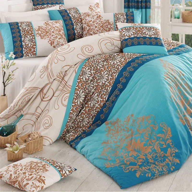 Lenjeria de pat Katre in nuante de turcoaz si albastru transforma dormitorul intr-un spatiu relaxant si elegant. Combinatia de culori moderne si designul sofisticat adauga un plus de prospetime si stil camerei tale. Fabricata din bumbac ranforce 100%, aceasta lenjerie este moale, placuta la atingere si permite pielii sa respire, asigurand un somn odihnitor si relaxant.