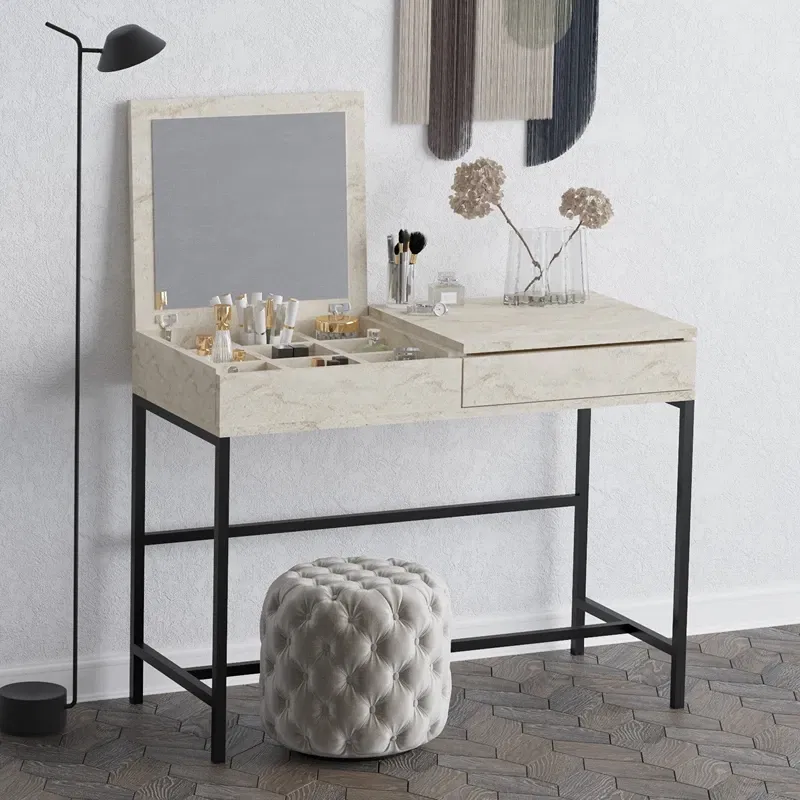 Fabricata din 100% pal melaminat, este rezistenta si usor de curatat. Picioarele metalice vopsite electrostatic asigura stabilitate si un aspect rafinat. Blatul spatios si rafturile integrate permit organizarea eficienta a accesoriilor si produselor cosmetice.