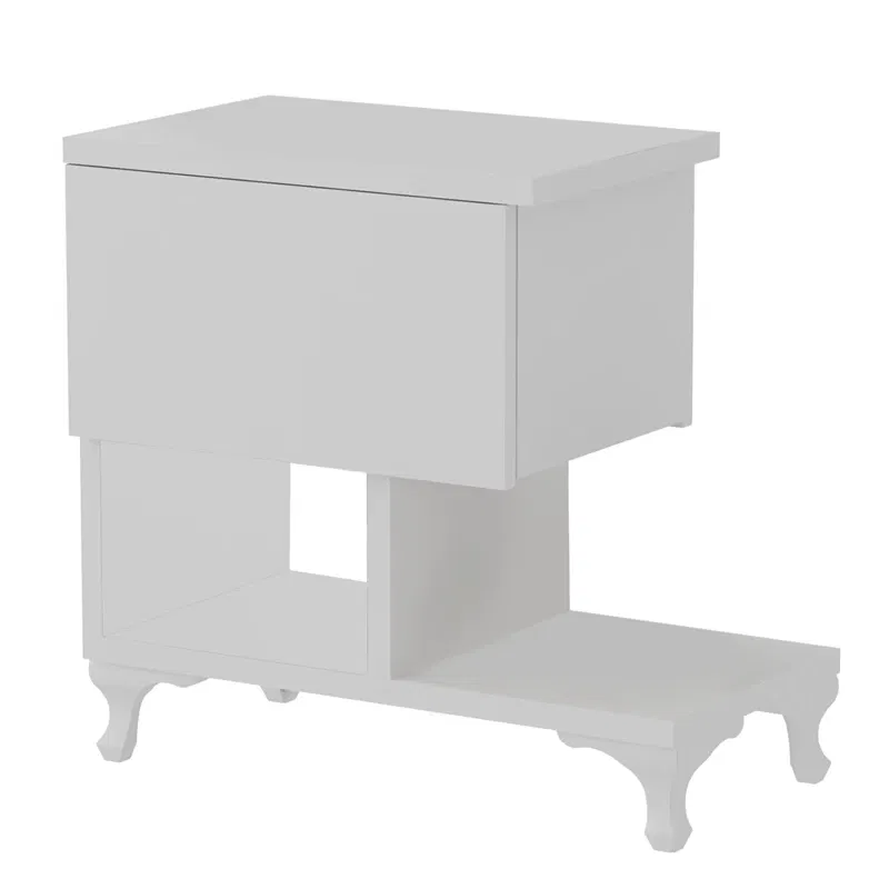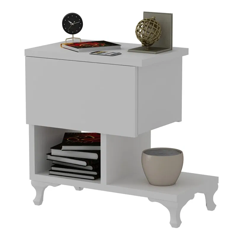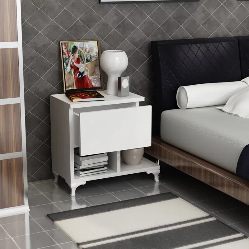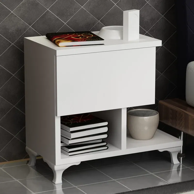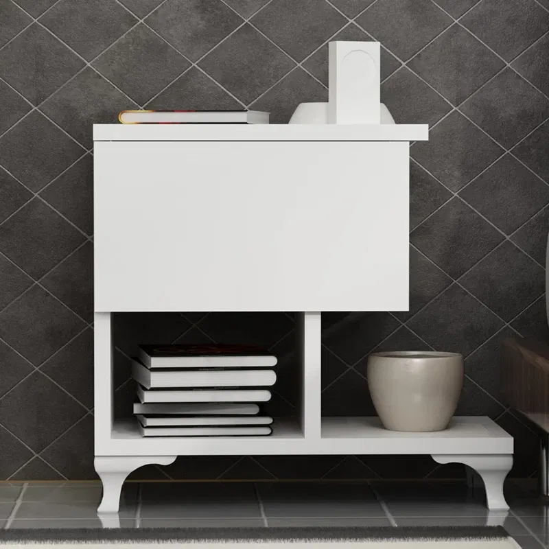 Se utilizeaza in dormitor pentru organizarea cartilor, ceasului si accesoriilor. Designul compact si combinatia de raft deschis cu sertar o fac ideala pentru interioare moderne.