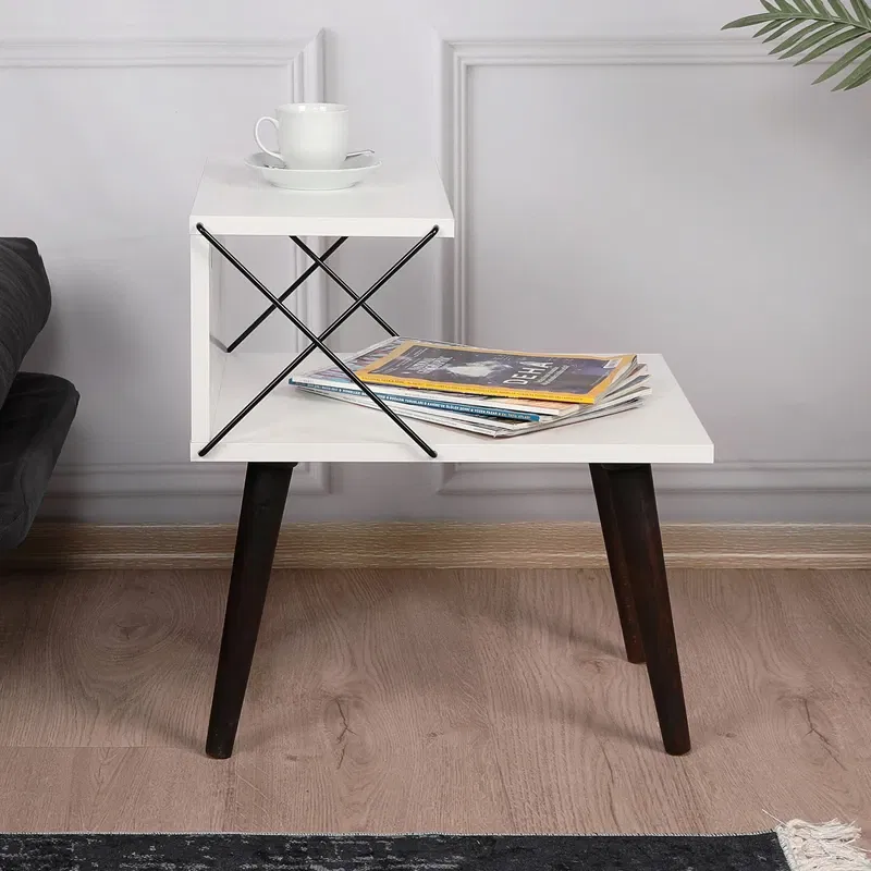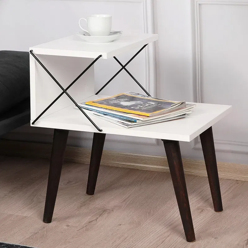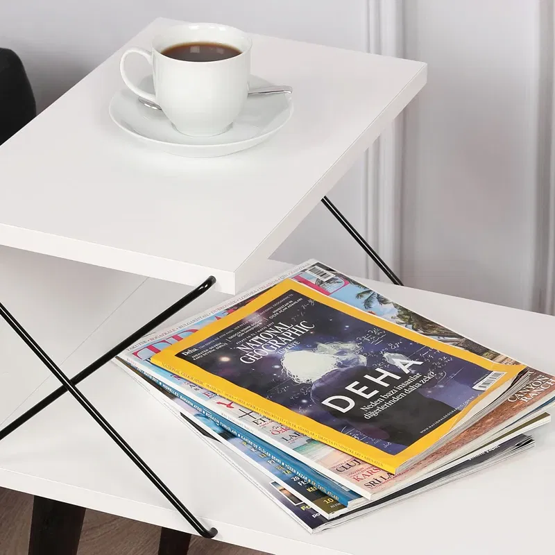 Dispune de doua polite generoase, dintre care cea inferioara este potrivita pentru depozitarea cartilor si revistelor, iar cea superioara poate sustine o lampa sau alte accesorii decorative.