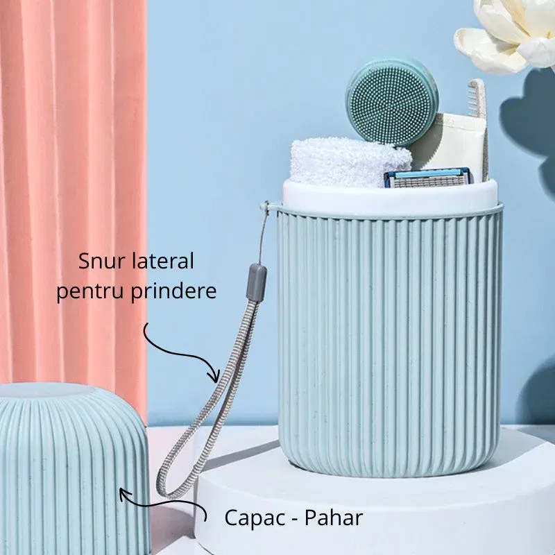 Organizatorul se deschide in doua parti, transformandu-se in doua pahare. In interior poti depozita periuta de dinti, pasta, un prosop mic, pieptene, aparatul de ras si alte obiecte esentiale pentru igiena zilnica. Este usor de curatat si rezistent la uzura, fiind ideal pentru utilizare frecventa in calatorii. Se potriveste perfect in orice bagaj datorita formei sale compacte si este suficient de elegant incat sa il poti folosi si acasa, daca iti place sa ai lucrurile bine separate si organizate.